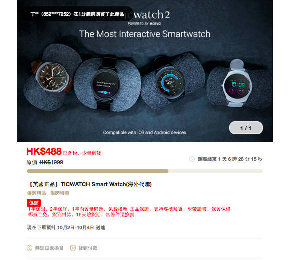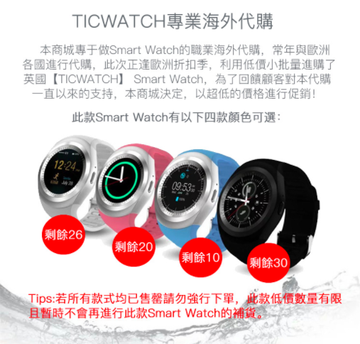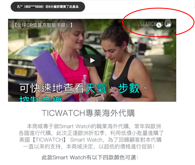 1. 以下網站主要販賣 Ticwatch 2 智能手錶假貨,套上Searching C的片販賣假貨,一般以“貨到付款”來吸引客人下單。但當快遞派送產品時,快遞會要求先收取款項,客人才可以打開包裹。當打開後,發覺有關產品並不是客人所訂購或與網站描述影片和文字完全不相符。曾經就有一位客人收到一隻膠手錶,完全不是 Ticwatch 2 智能手錶。當客人希望退貨時,快遞便會說他們只負責派送,客人需與商家直接聯繫。即使客人發電郵、Facebook 訊息,並致電給他們客服,最後也得不到任何回應。