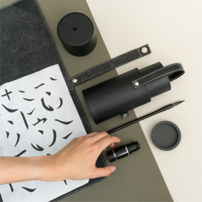 整個產品最驚喜是⼝紅設計的墨條。打開蓋扭一扭便可磨墨,方便不髒手。一路磨還散發著墨香。墨條與大有製墨合作開發,書寫流暢有諳味。