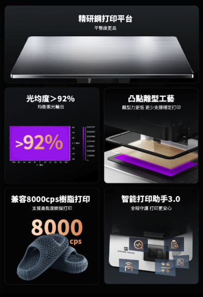 - 材料兼容性強:支援最高 8,000 cPs 黏度樹脂,涵蓋工程級、牙科材料、彈性複合材料,遠超一般桌面機僅支援 2,000 cPs 的限制。