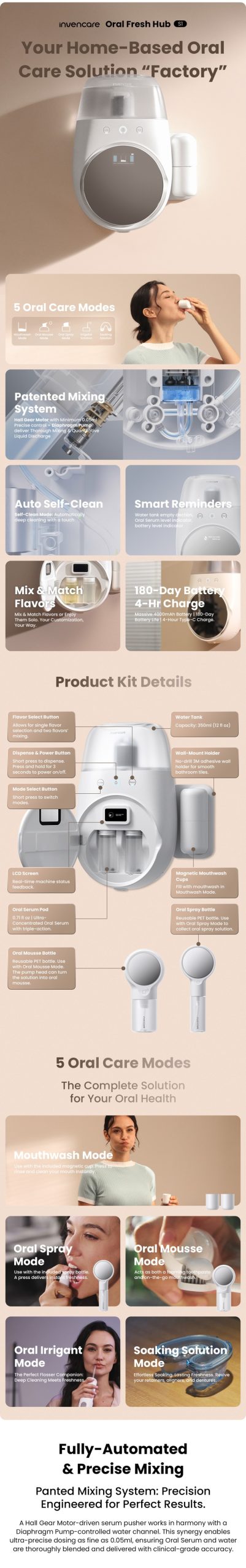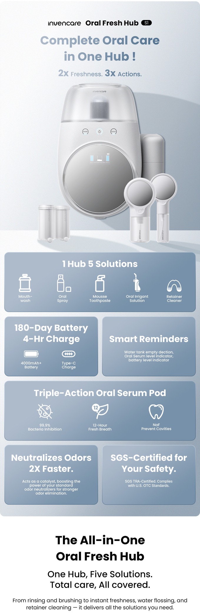 今日小編為大家介紹嘅 Oral Fresh Hub 一體化口腔護理中心,集5種專用口腔護理模式於一身:漱口水模式可抑制99.9%細菌;噴霧模式可隨身携帶,消除異味;慕斯模式可作旅行漱口水或牙膏;沖洗模式可清潔牙齒,清新口氣;浸泡模式則可清潔矯正器及固定器。一機全能,讓你輕鬆擁有全面口腔護理!