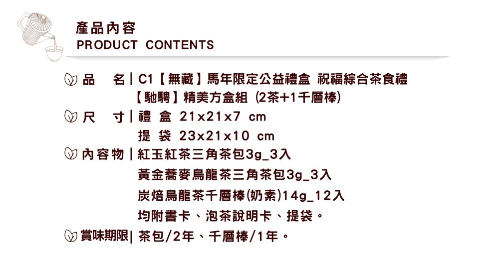 內容物:小茶罐3gx3入茶包x2罐(日月潭紅玉紅茶、黃金蕎麥烏龍茶)、烏龍茶千層棒14gx12支。附提袋。