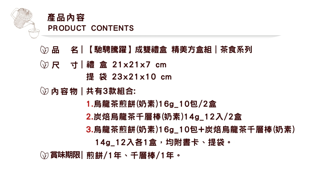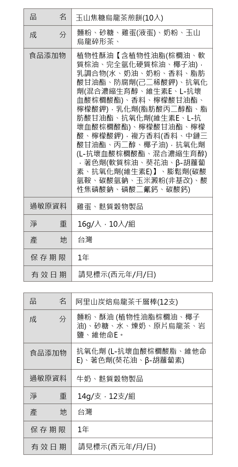 內容物:烏龍茶千層棒12支/盒、烏龍茶煎餅10包/盒。均附提袋、書卡。
