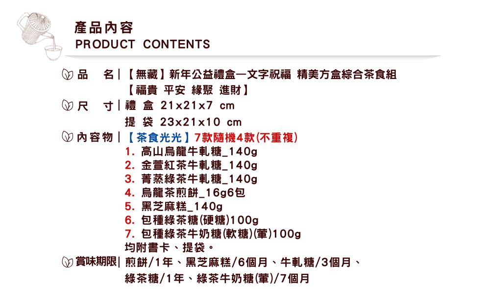 內容物:7款茶食,隨機4款(烏龍茶煎餅16gx6包、高山烏龍/金萱紅茶/菁蒸綠茶牛軋糖x140g、黑芝麻糕x140g、包種綠茶硬糖100g、包種綠茶牛奶糖(葷)100g)。附提袋。