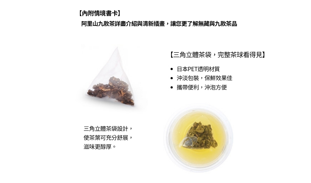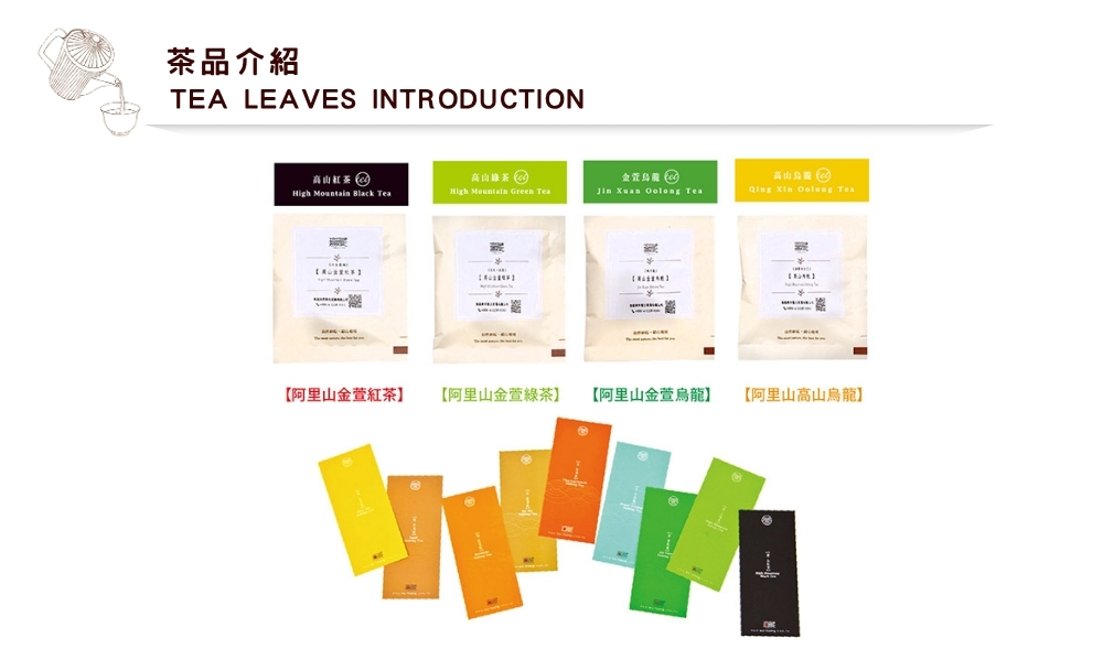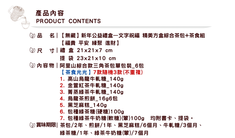 內容物:阿里山綜合茶包3gx6包,7款茶食,隨機3款 (烏龍茶煎餅16gx6包、高山烏龍/金萱紅茶/菁蒸綠茶牛軋糖x140g、黑芝麻糕x140g、包種綠茶硬糖100g、包種綠茶牛奶糖(葷)100g)。附提袋。