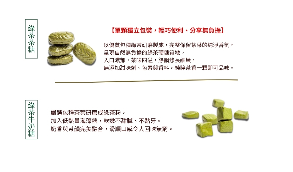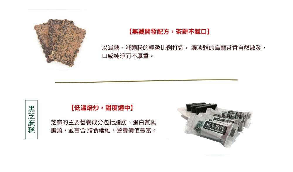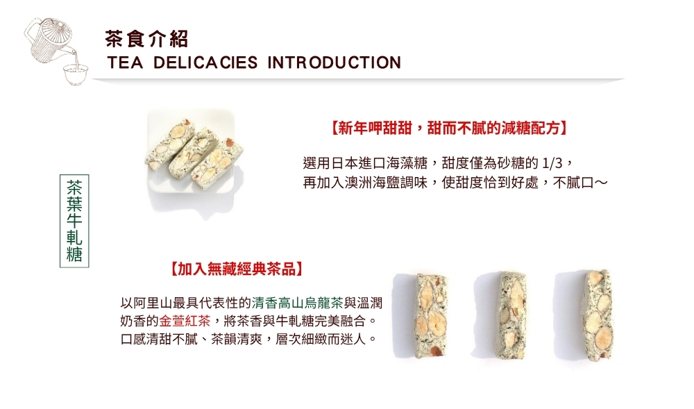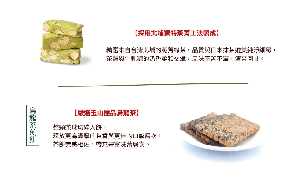 保存期限:茶葉2年、煎餅1年、黑芝麻糕6個月、牛軋糖3個月、綠茶硬糖1年、牛奶糖(葷)7個月。