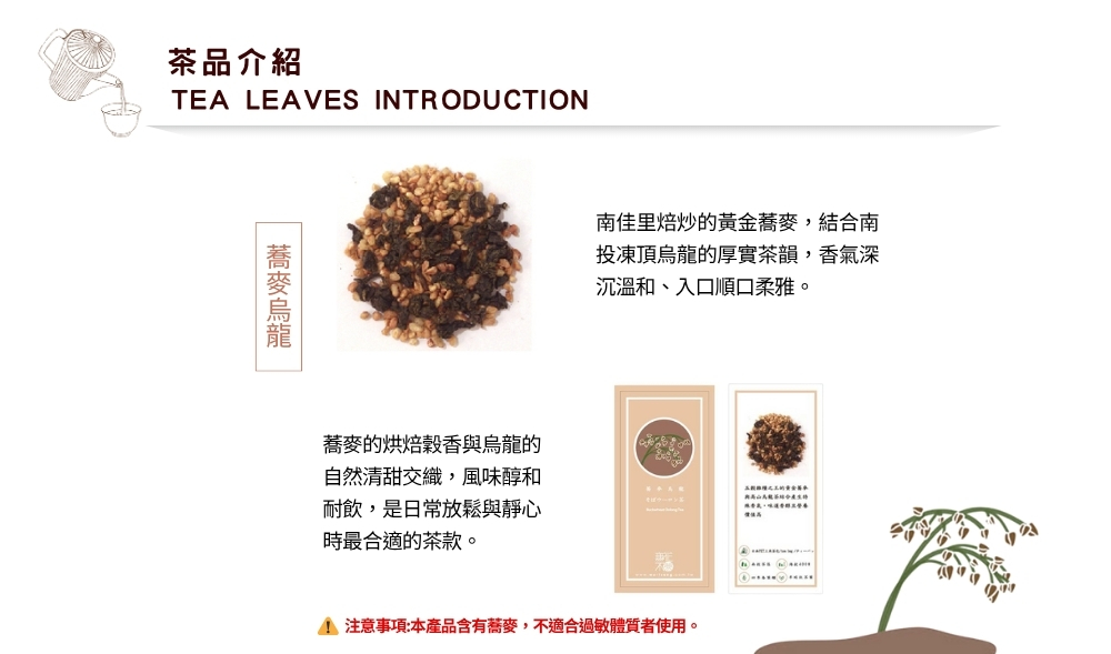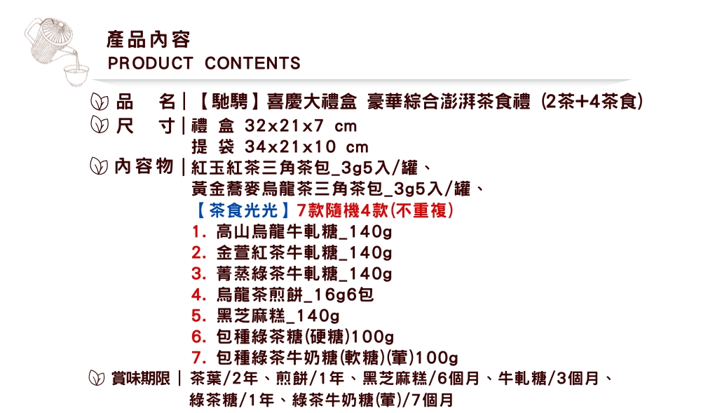 內容物:小茶罐3gx5入茶包(蕎麥烏龍茶+紅玉紅茶)、茶食7款隨機4(烏龍茶煎餅16gx6包、紅茶/烏龍/綠茶牛軋糖x140g、黑芝麻糕x140g、包種綠茶硬糖100g、包種綠茶牛奶糖(葷)100g) 、提袋、書卡。