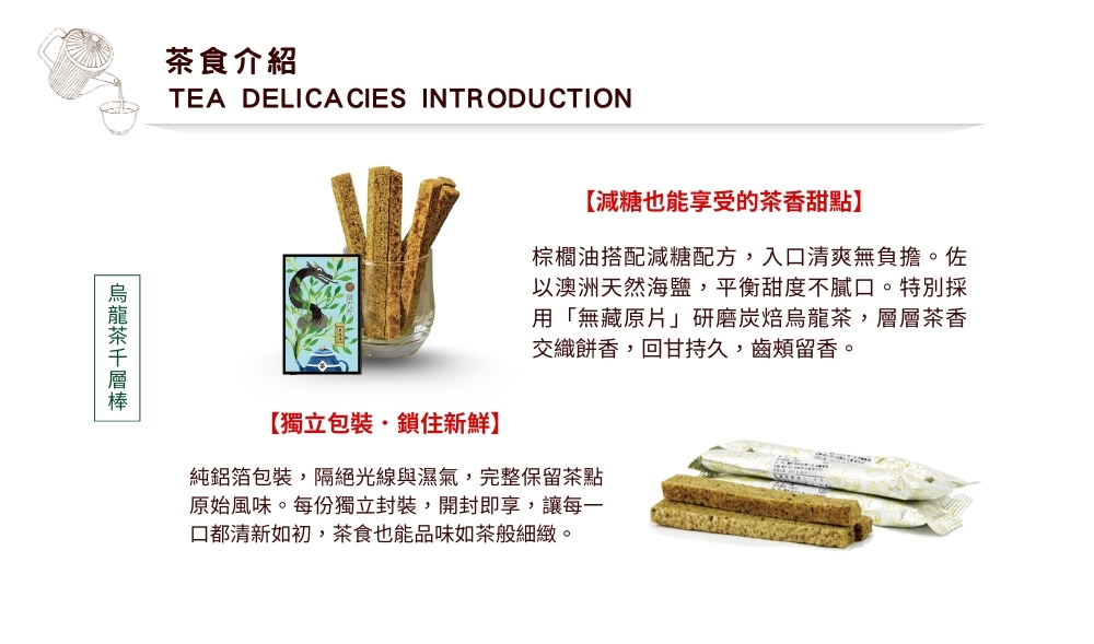 內容物:小茶罐3gx3入茶包(日月潭紅玉紅茶+蕎麥烏龍茶)、烏龍茶千層棒14gx12支、烏龍茶煎餅16gx10包。 均附提袋、書卡。