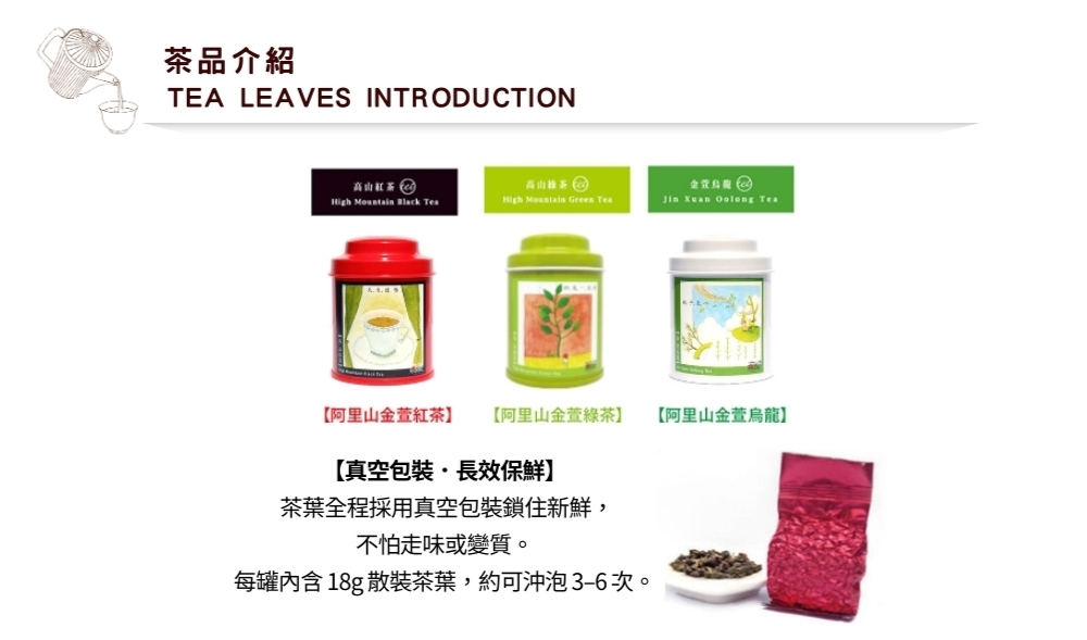 內容物:金萱紅茶18gx1罐、金萱綠茶18gx1罐、金萱烏龍18gx1罐、茶食7款隨機3(烏龍茶煎餅16gx6包、紅茶/烏龍/綠茶牛軋糖x140g、黑芝麻糕x140g、包種綠茶硬糖100g、包種綠茶牛奶糖(葷)100g) 、提袋、書卡。