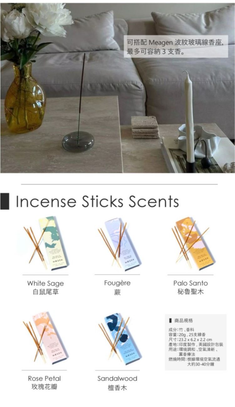 香料的微顆粒手感與粉末皆屬天然線香的獨特質地。由於香料特性可能導致包裝出現油漬,但並不影響商品品質與使用。