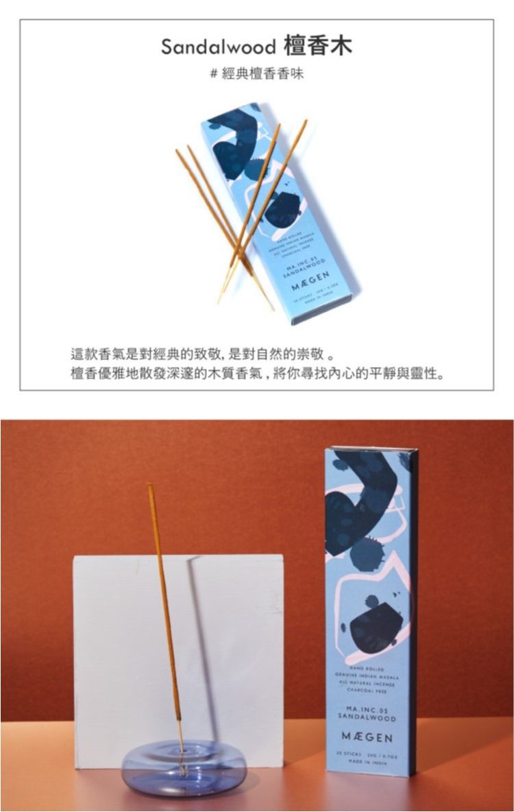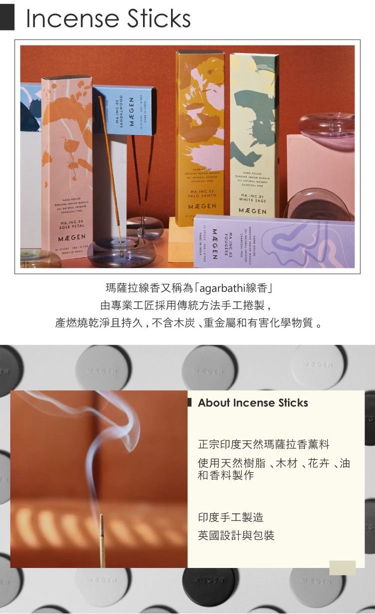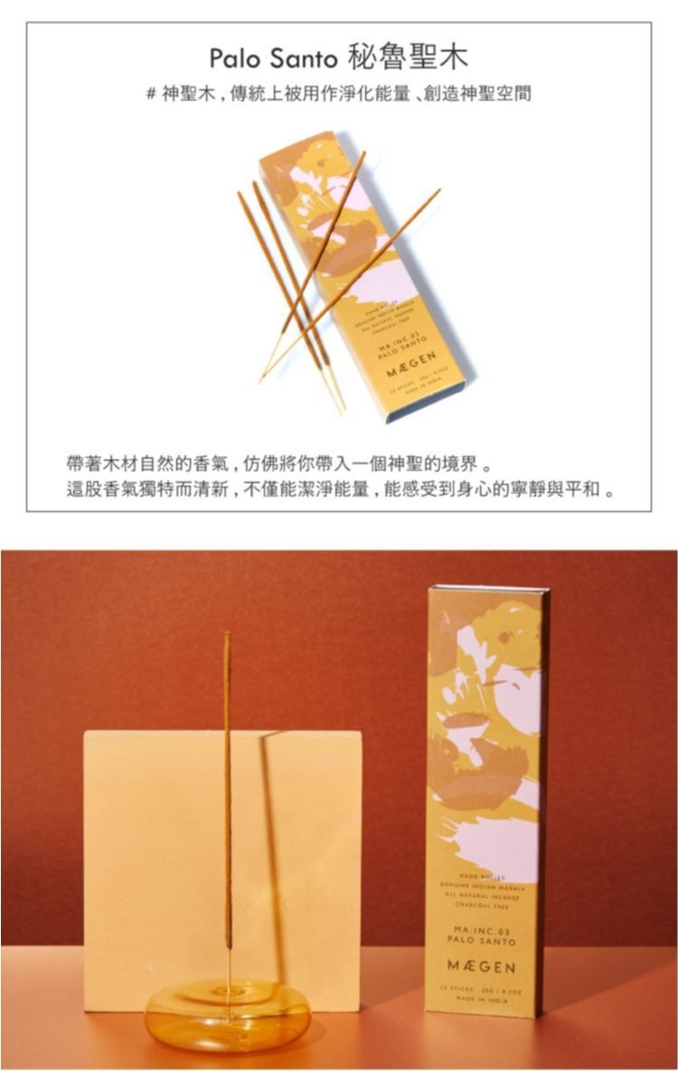 - 使用天然樹脂、木材、花卉、油和香料製作,每一支線香由專業工匠採用傳統方法手工捲製,