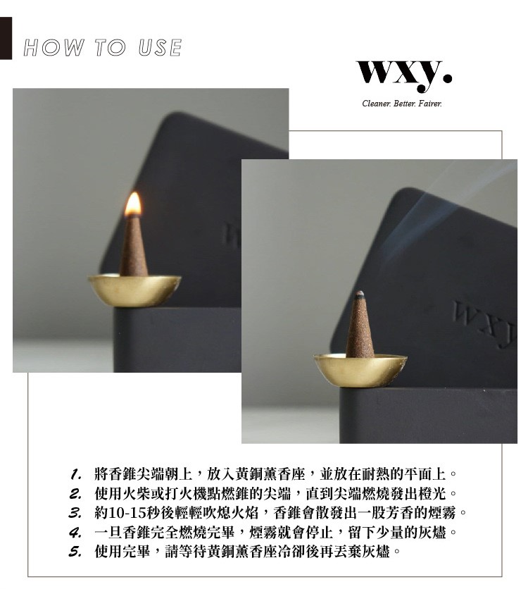 1. 將香錐尖端朝上,放在黃銅薰香座上,並放在耐熱的平面上。