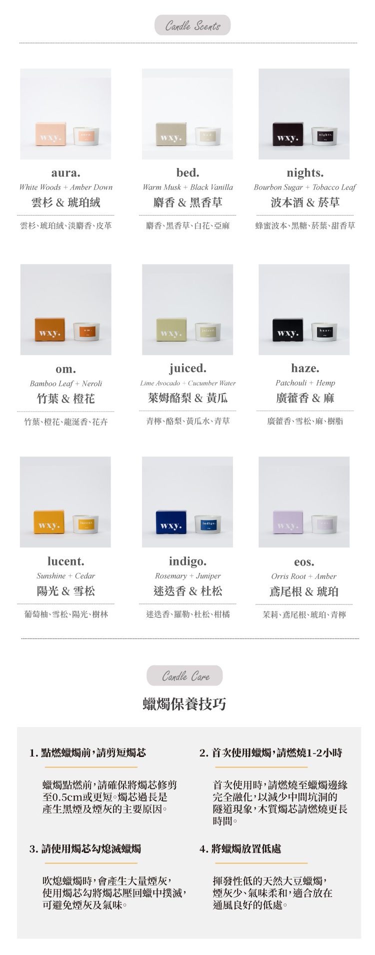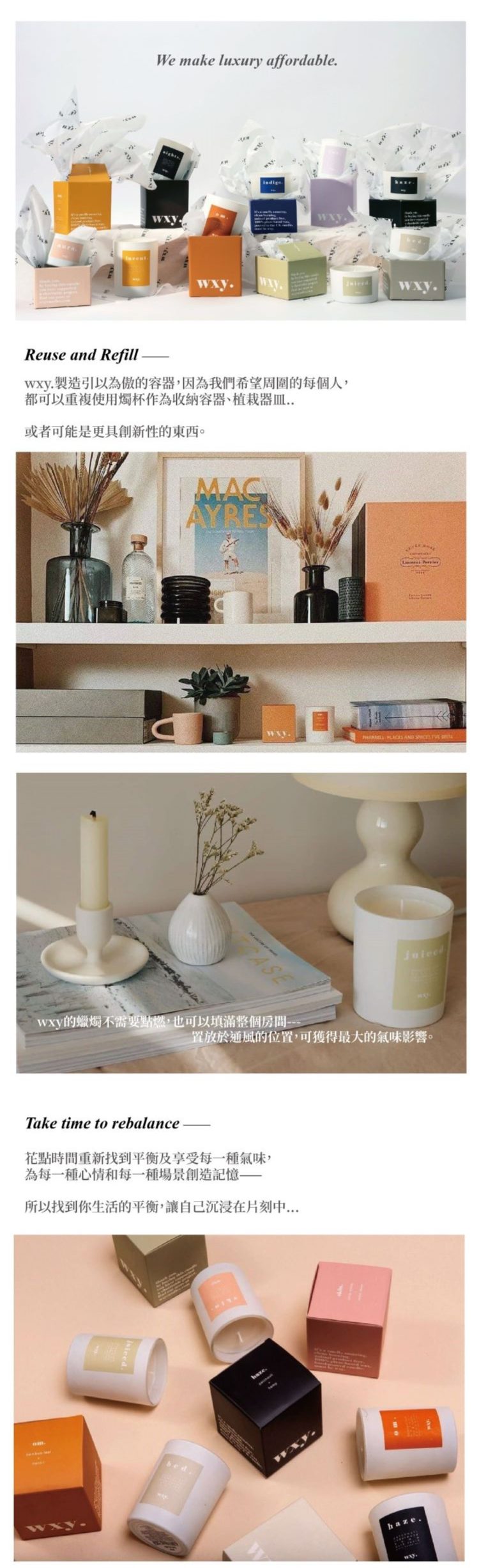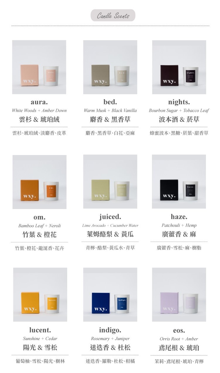 wxy 設計的日常氣味蠟燭,100%植物蠟製作,完美契合你的心情,每日都讓自己沉浸在經典的香味中…