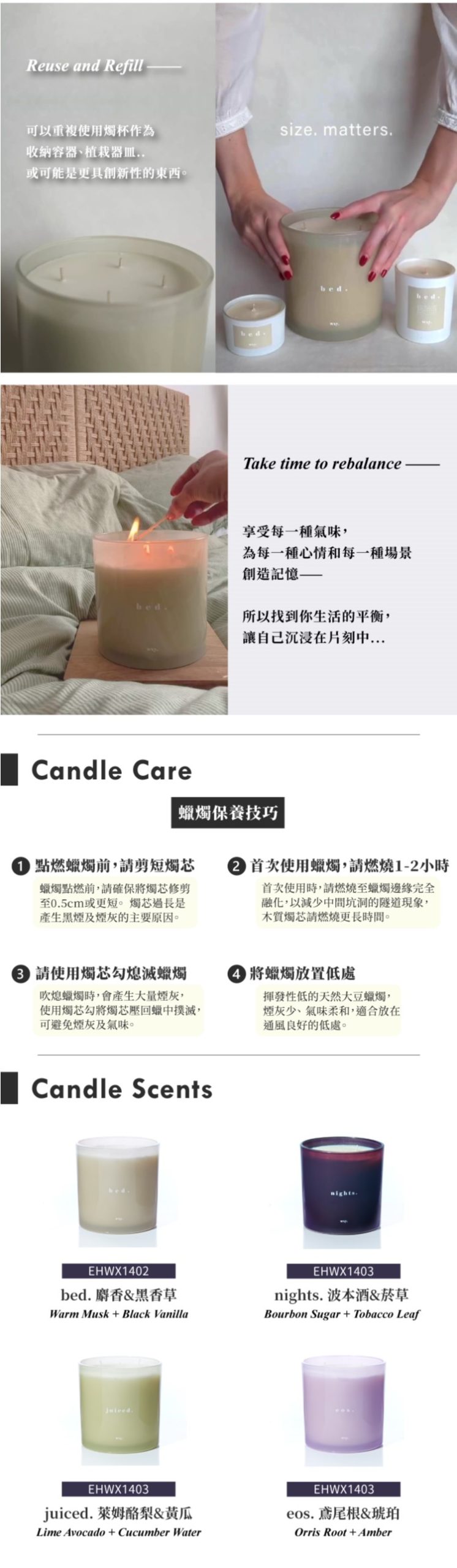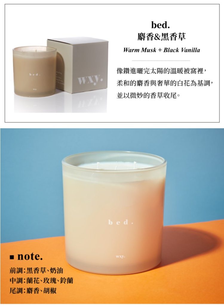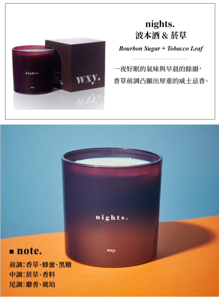 wxy 設計的日常氣味蠟燭,100%植物蠟製作,完美契合你的心情,每日都讓自己沉浸在經典的香味中…將經典蠟燭系列裡挑出最受歡迎的四款香味,並將蠟燭放大到原始大小的7.5倍!! 讓蠟燭成為一件能燃燒數月的宣言作品~