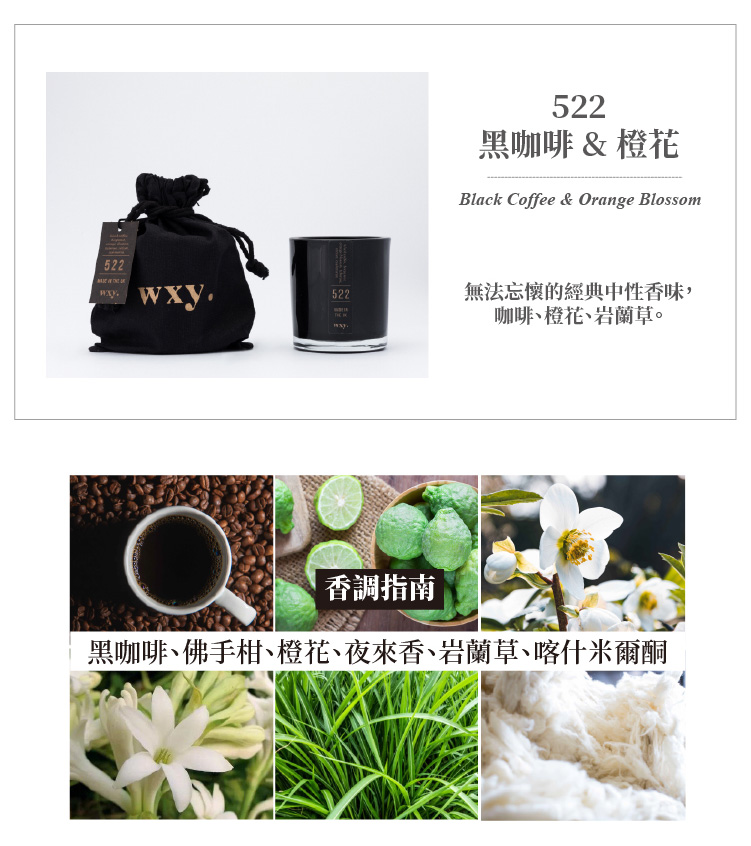 品名:wxy Umbra 大豆蠟燭 – 522 黑咖啡 & 橙花