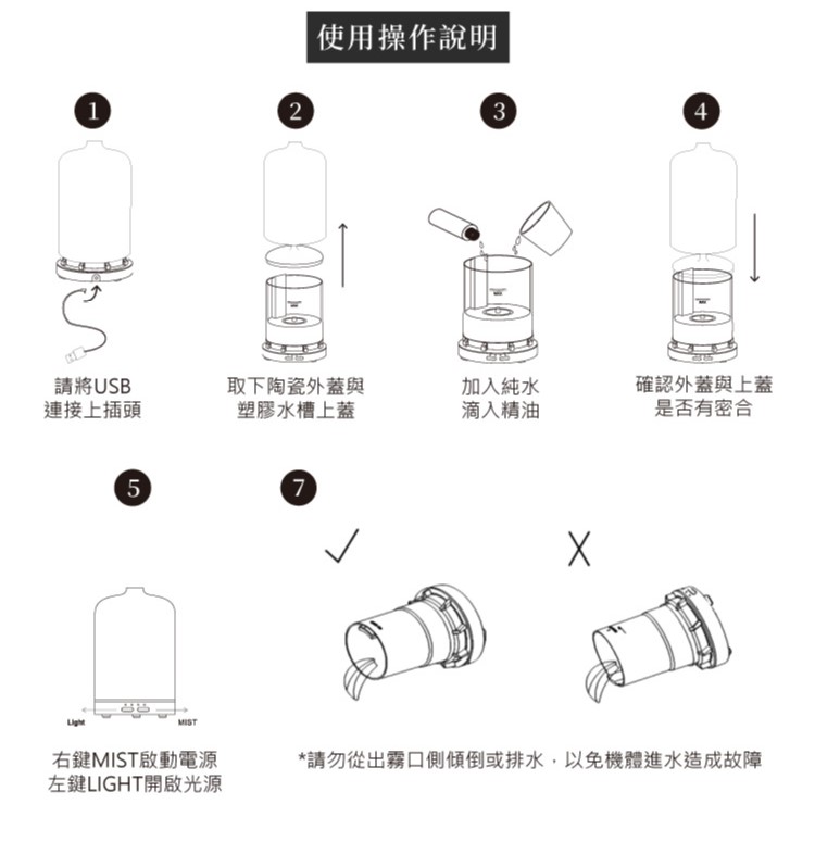 ⑧機台請置於幼童無法觸摸處,以避免打翻機台,導致幼童觸電及誤食精油。