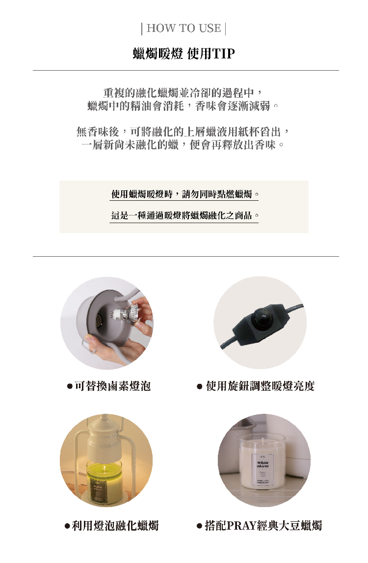 1.使用此蠟燭暖燈請勿點燃蠟燭。