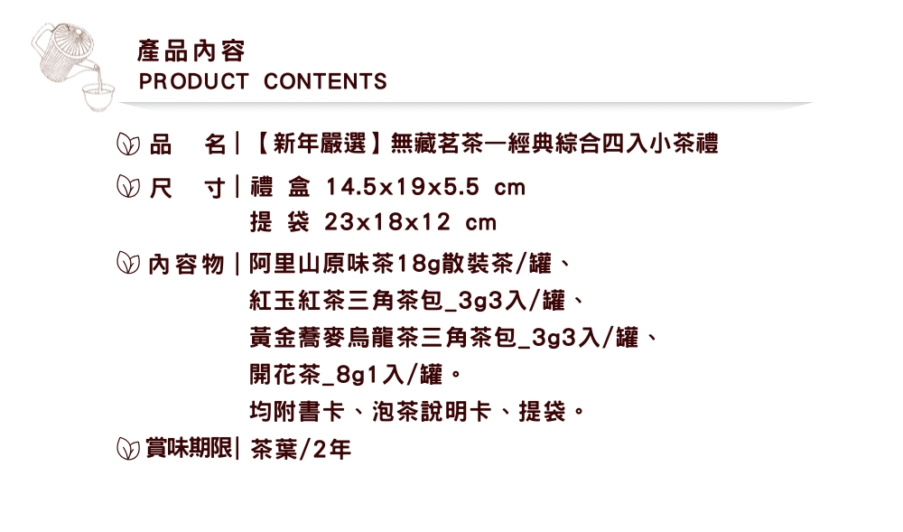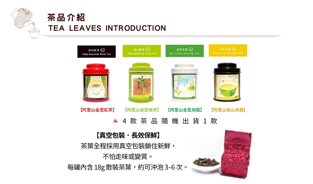 內容物:阿里山原味茶18g x1罐/蕎麥烏龍茶3gx3入 x1罐/臺茶18號 紅玉紅茶3gx3入 x1罐/開花茶8g x1罐。附提袋