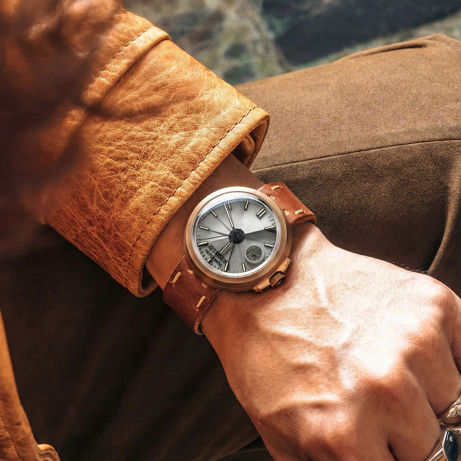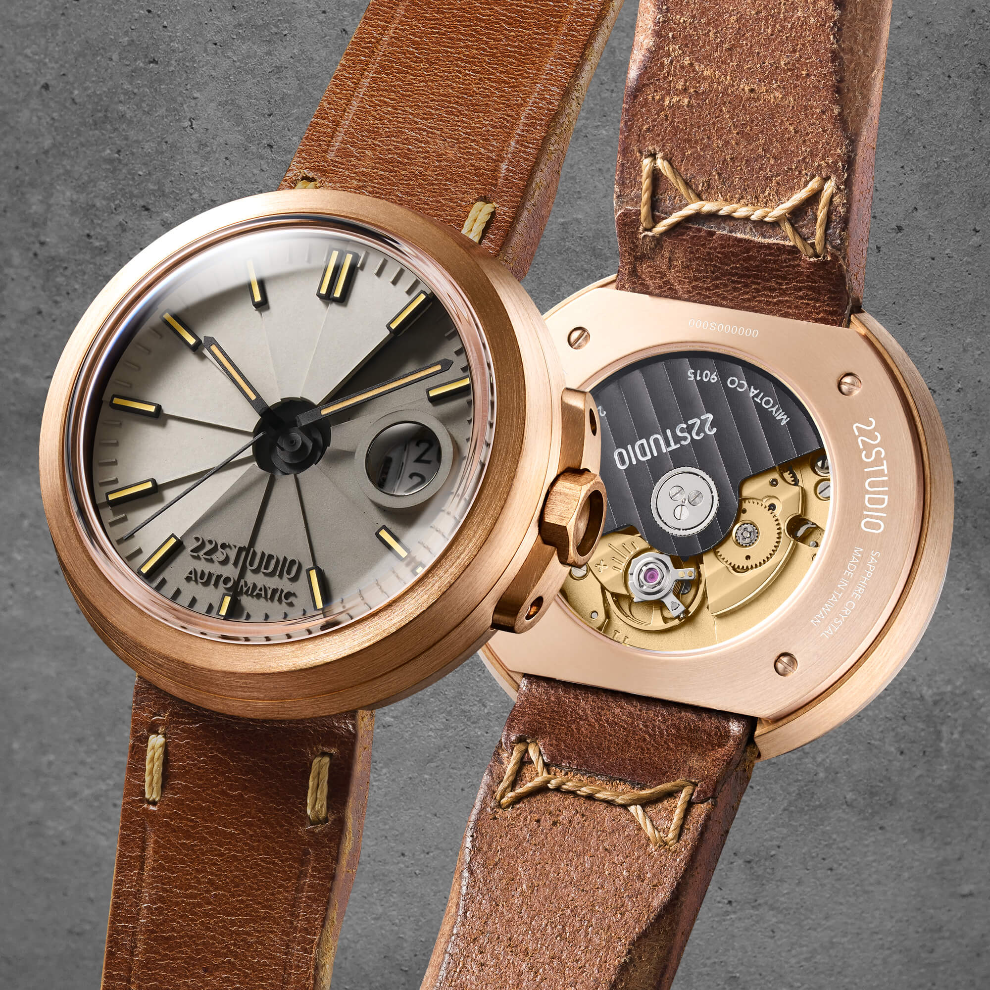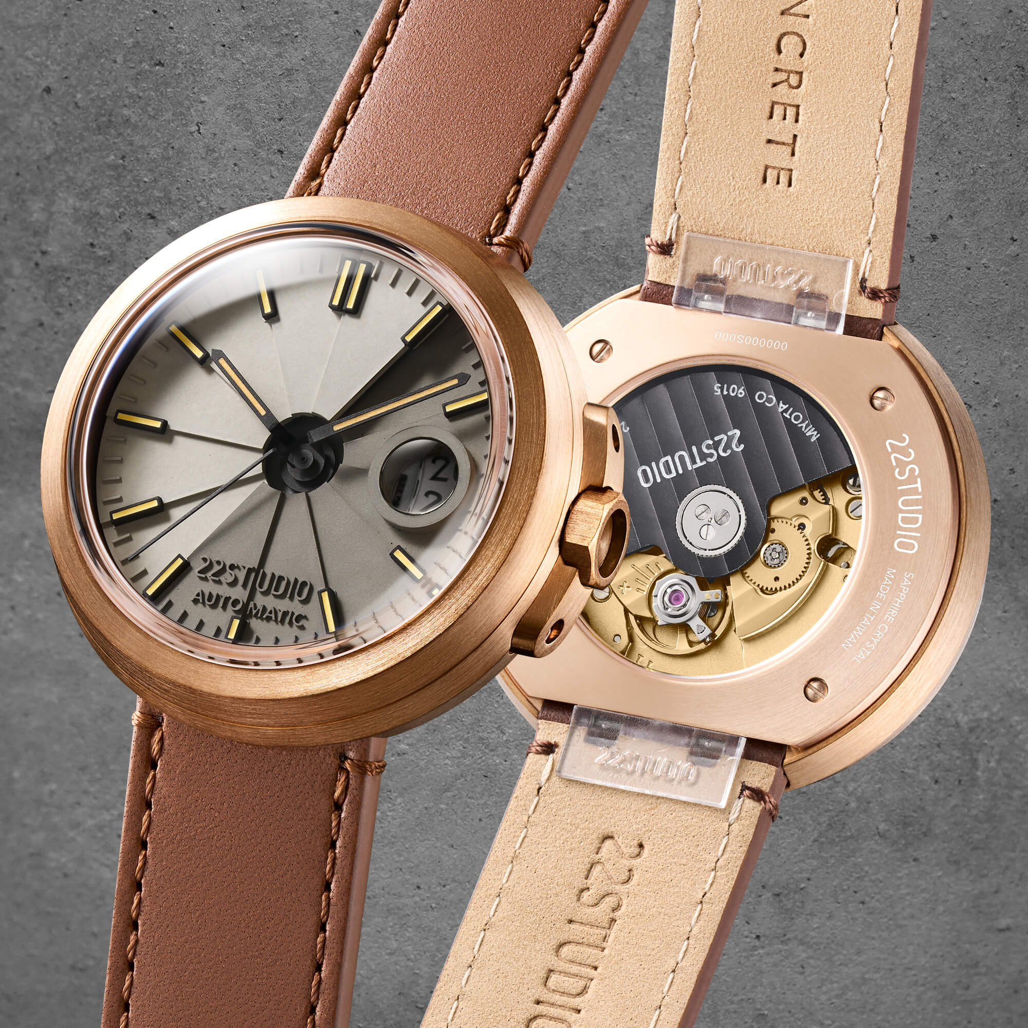 米色與石柱灰色清水模錶盤、青銅毛絲面錶殼、搭配黑色指針與時標、復古橘色超級夜光、咖啡色植揉革錶帶,濃濃的safari風格,青銅的特色在經過長時間的使用後,會氧化改變色澤,產生深淺程度不同或局部霧狀紋路。經過時間的洗禮產生的使用印記,是22STUDIO認為手錶最美的狀態。(*出貨時,青銅為全新未氧化玫瑰金狀態。)
