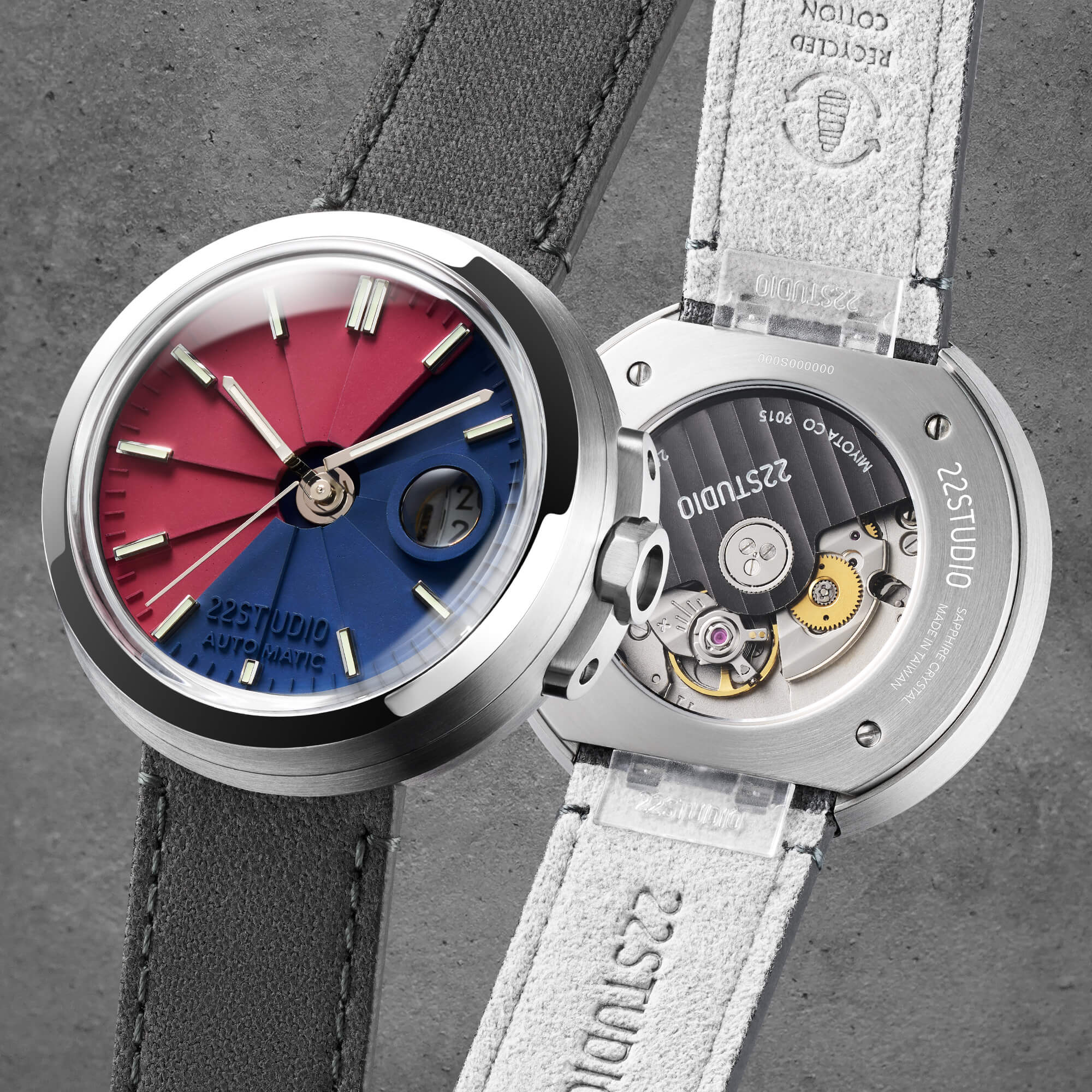 紅藍雙色清水模錶盤、切角拋光不鏽鋼錶殼、亮面銀色指針與時標,於不同光影下閃閃發亮,傳達精準俐落同時自信大膽的現代風格,特別搭配碳黑色回收棉錶帶,承載著資源循環再利用的理念,並將極簡而時尚的設計風格完美呈現。