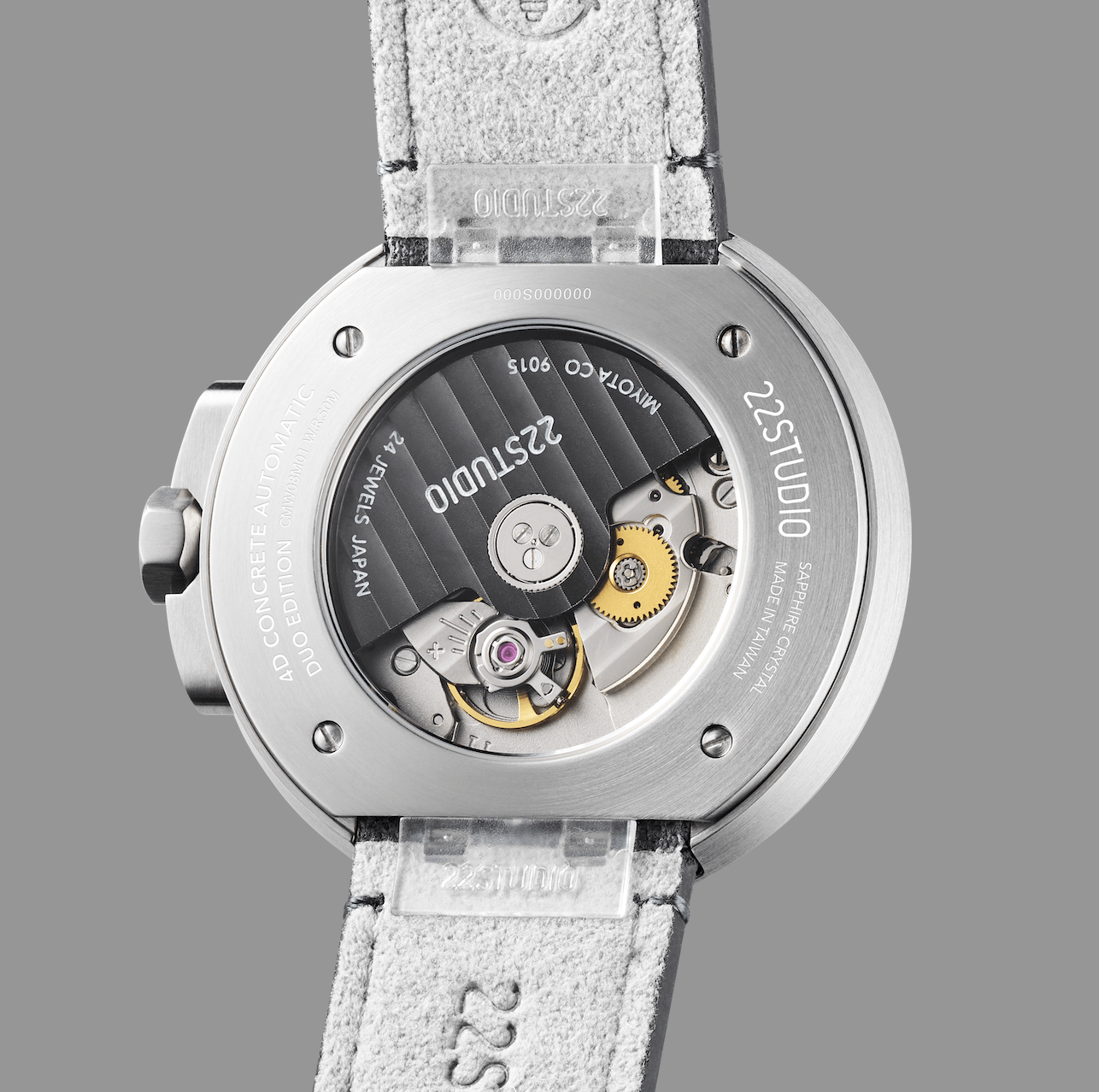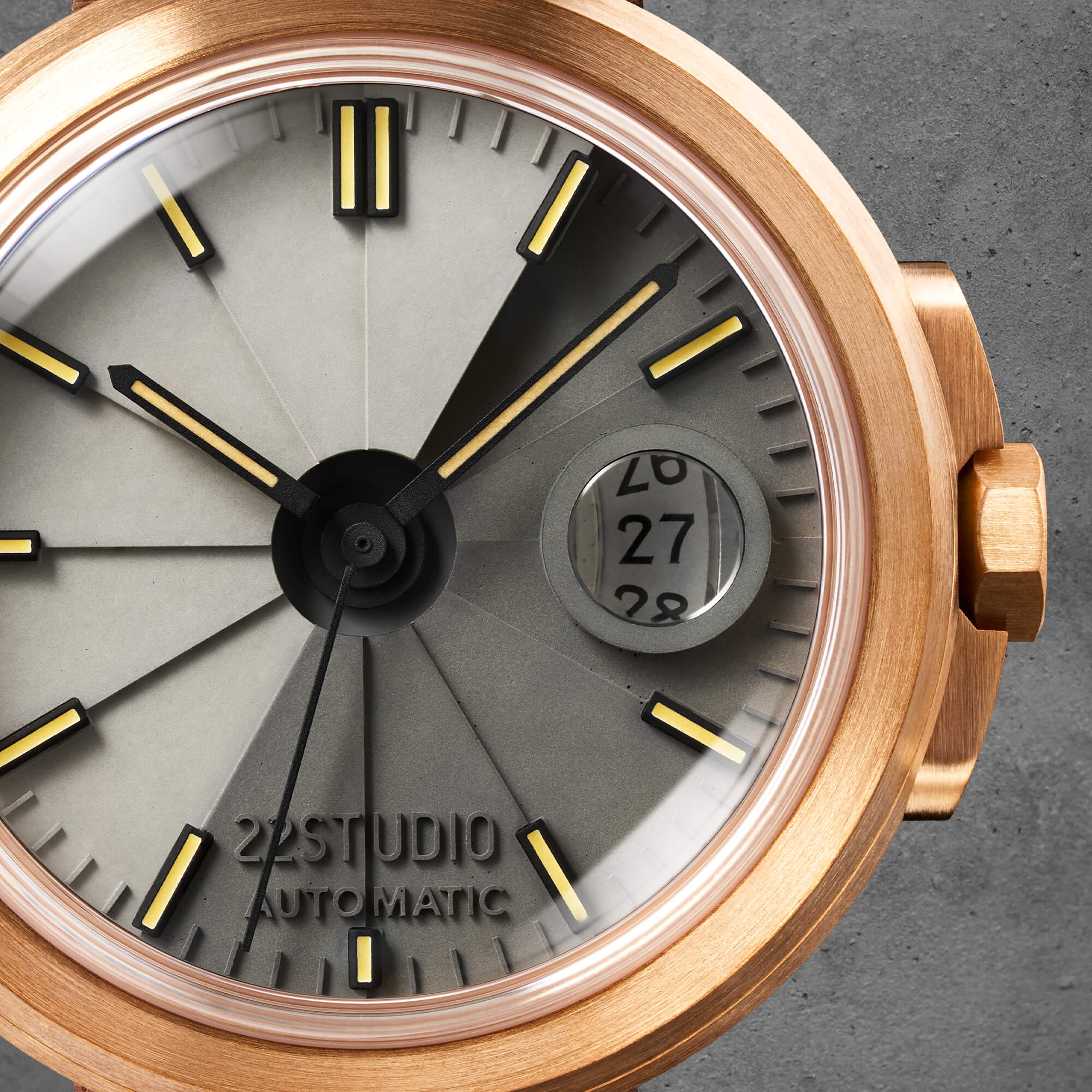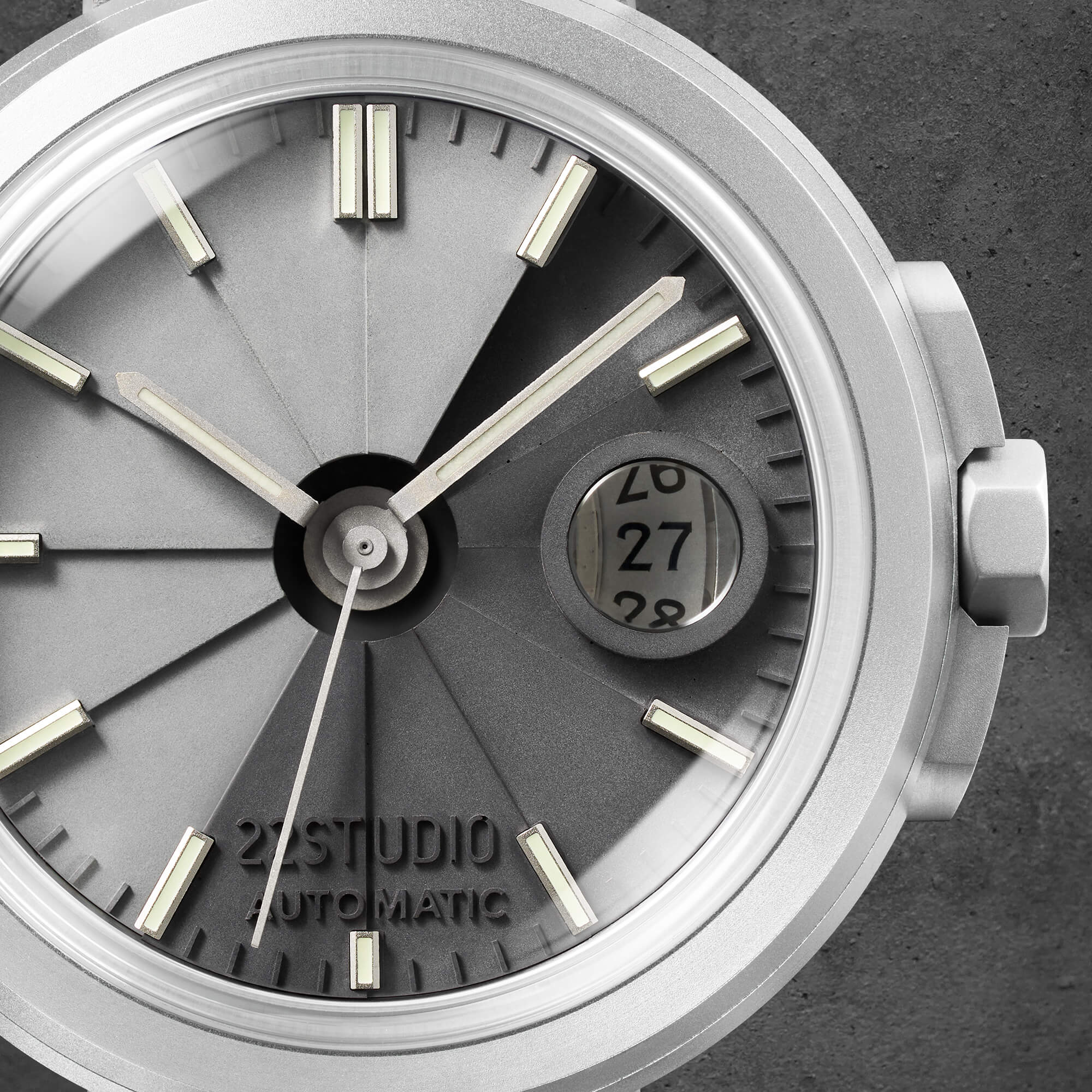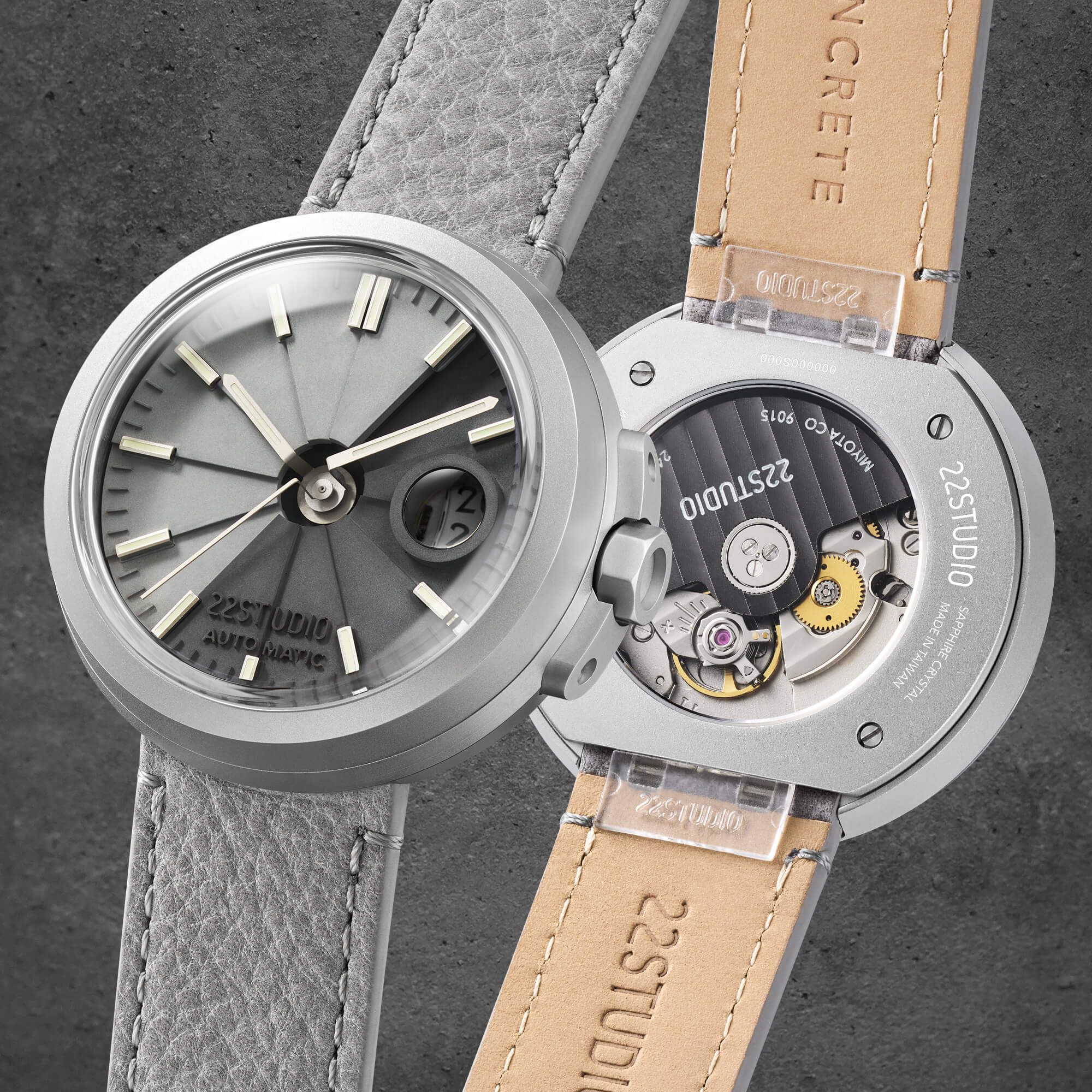 22STUDIO水泥感最高的標誌性配色首次搭配於機械錶款,深淺灰色高密度清水模錶盤、噴砂霧面不銹鋼錶殼、搭配霧面灰指針、C3綠色超級夜光、灰色壓紋皮革。