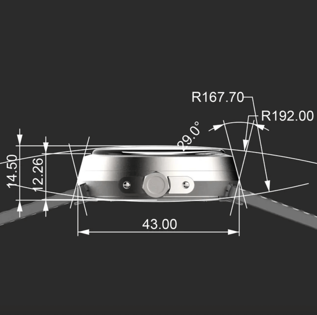 錶殼:直徑43mm(含錶冠46mm)、厚度12.5mm(含玻璃14.5mm)。