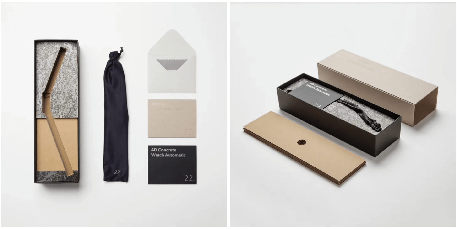 22STUDIO產品的包裝設計,盡可能全部使用紙材製作,展現各種紙材原本的個性。最外層是灰色的紙板,使用厚的灰紙板鍘半斷折成圍套,內層使用層層堆疊的防震性回收紙漿瓦愣紙,手錶將會放入專屬防塵袋後再放入錶盒中。