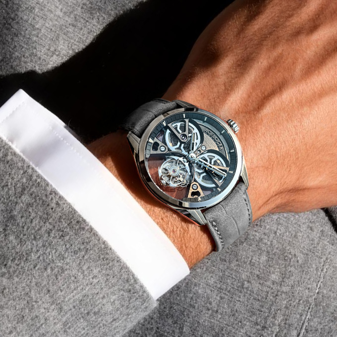 鏤空設計重建錶盤佈局,使機械運作清晰可見;細雕刻的字母和拋光的表面紋理注入現代設計活力和結構層次