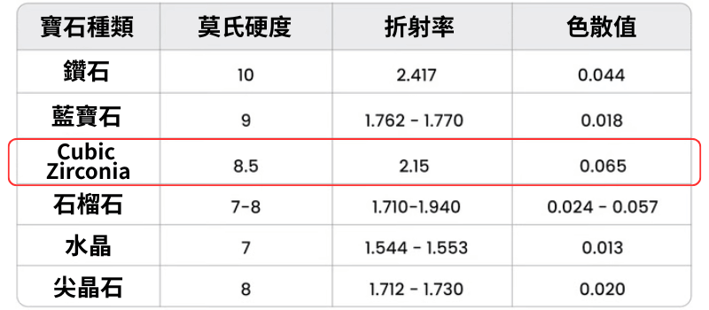 最終選擇了 VVS Grade Cubic Zirconia,硬度達到8.5,火彩堪比鑽石 (折射率和色散值),硬度比水晶還要硬,但價格卻大大降低!