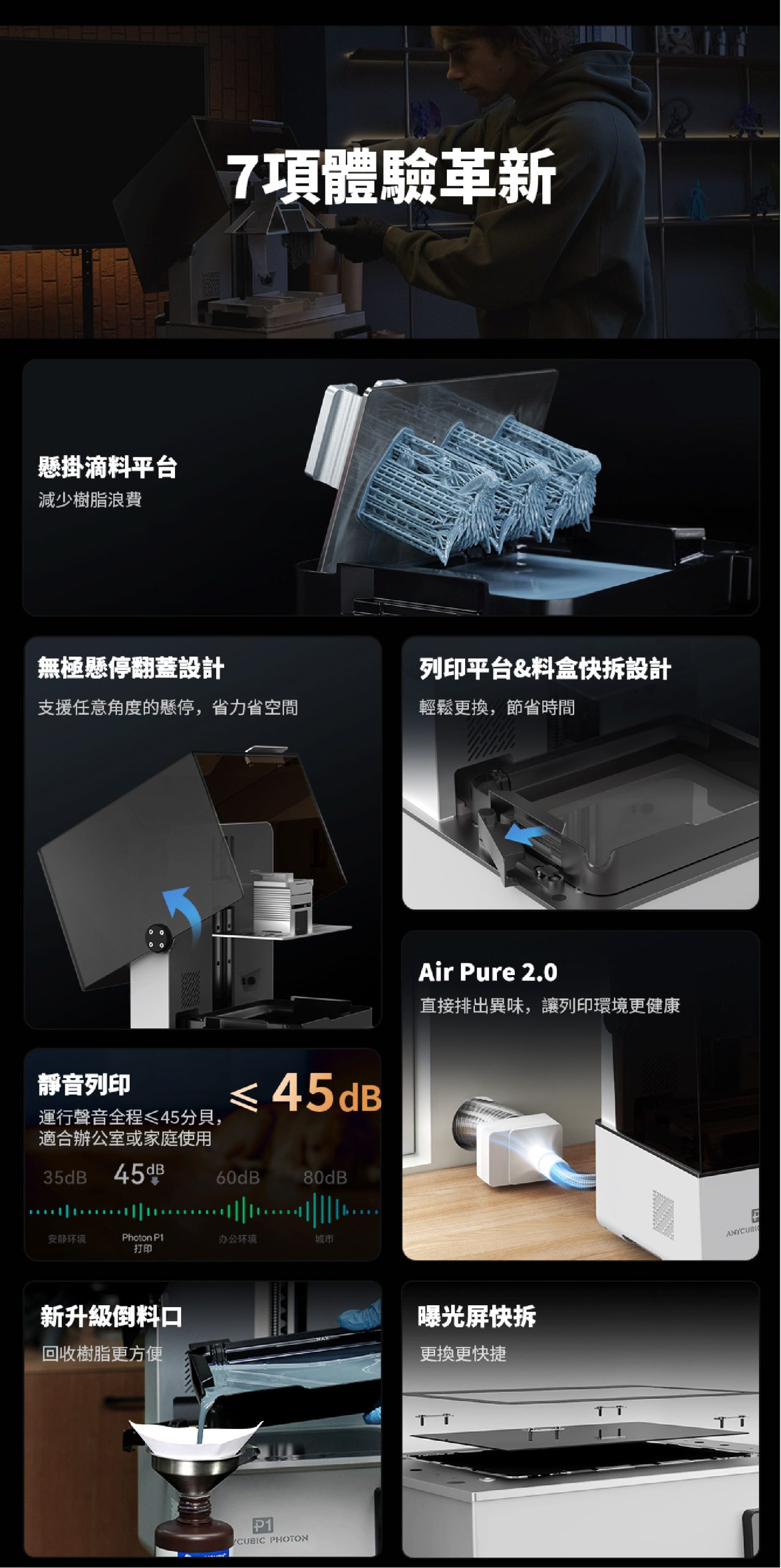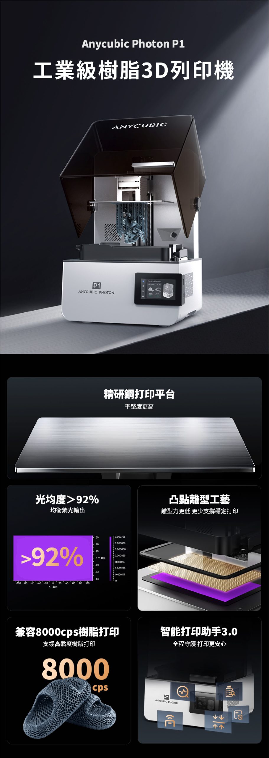 A:Anycubic Photon P1 是新世代桌上型光固化列印機,結合工業級精準度與消費級簡易性。