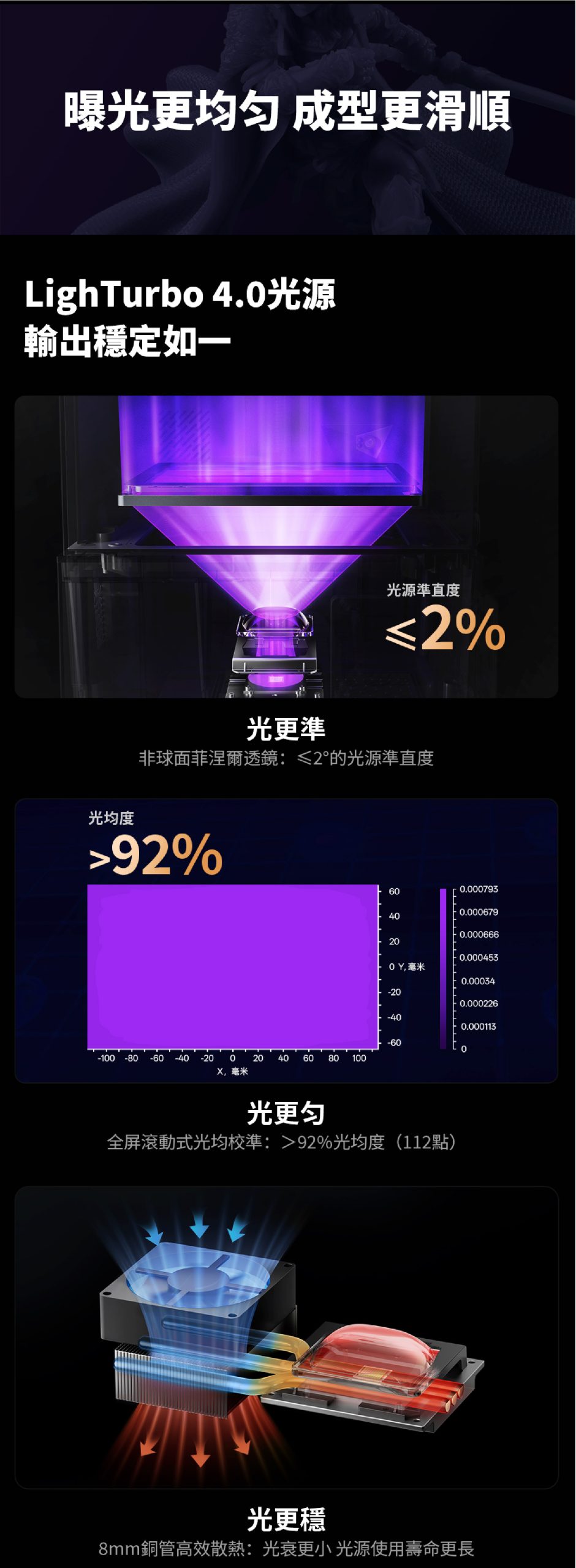 A:LighTurbo 4.0 光學引擎配備非球面菲涅爾透鏡,準直精度 < 2°,光線均勻度超過 92%。確保更清晰的邊緣、更精細的細節呈現,以及整個成型區域的平滑均勻固化,讓每一層都清晰一致。