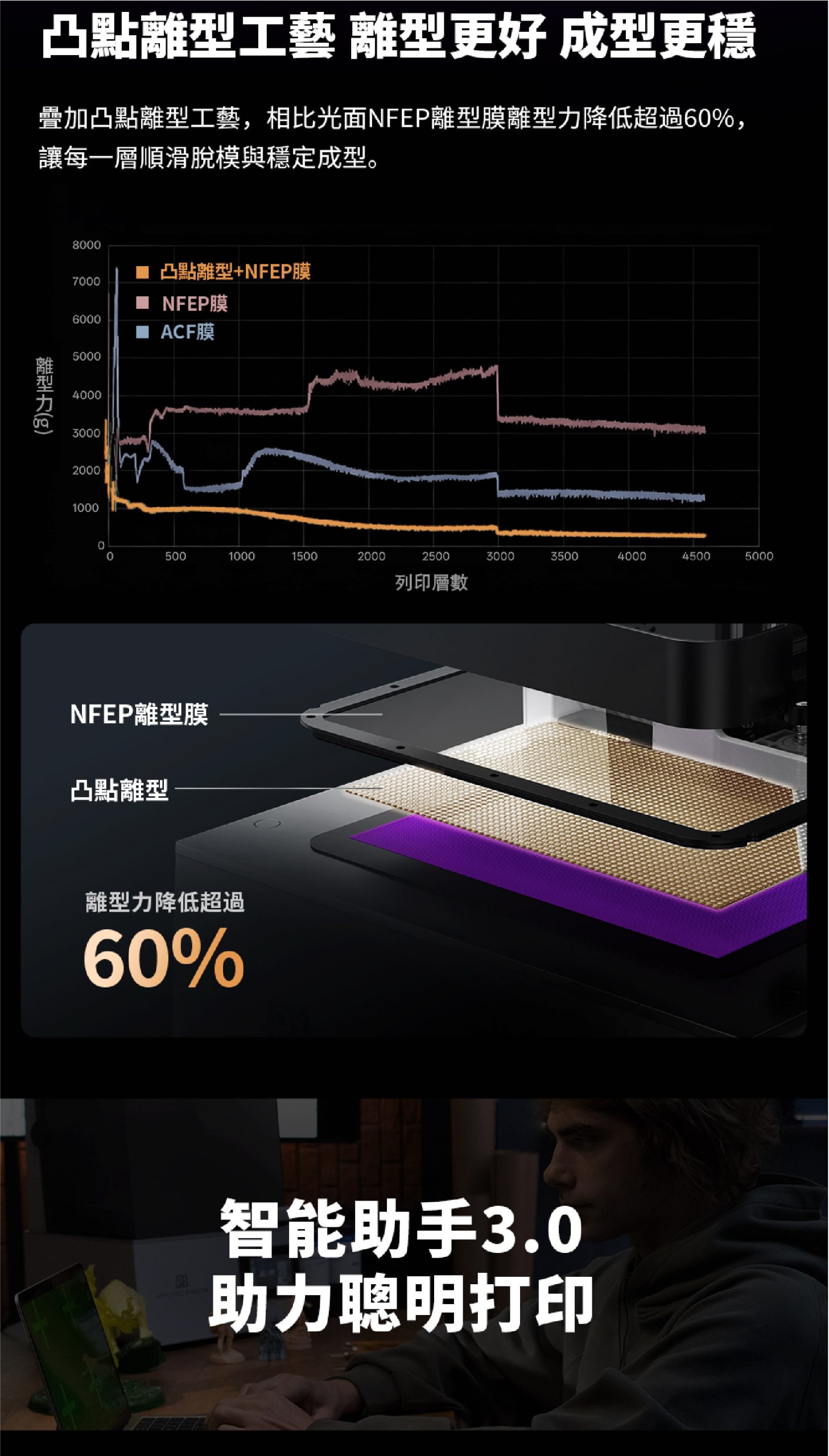 - Photon P1 採用波浪脫模技術,將剝離力降低達 60%,減少模型與樹脂槽的壓力。有助於實現更平滑的表面、更安靜的列印與更可靠的結果。