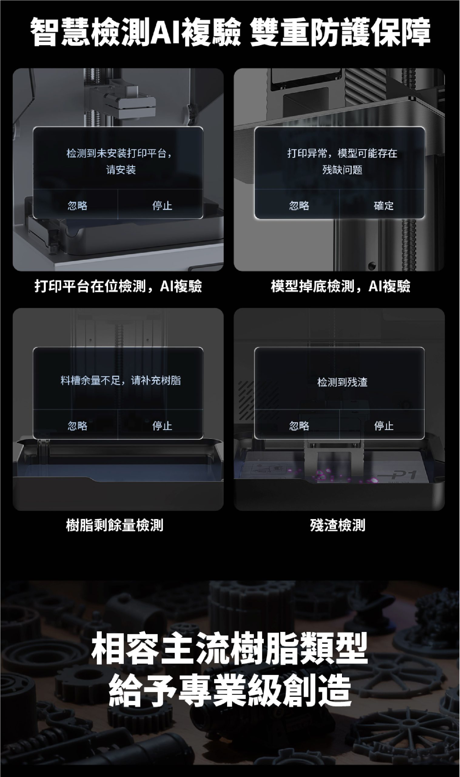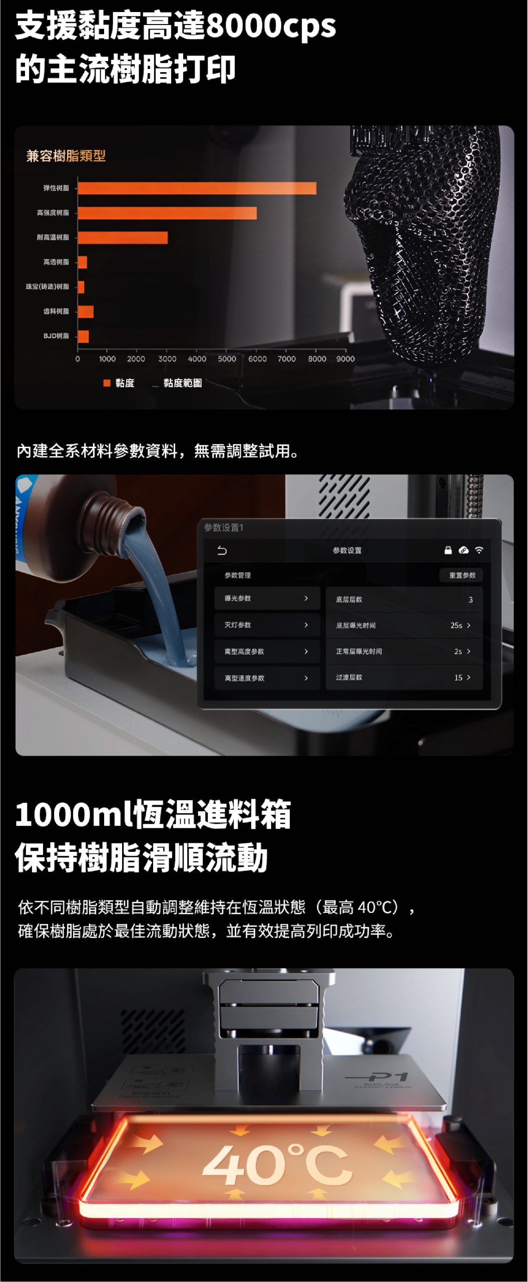 A:Photon P1 相容多種樹脂,包括標準、彈性、透明與高黏度工業材料——最高達 8000 cps。升級的離型膜與動態平衡系統確保即使使用較濃稠、高黏度的樹脂,也能穩定附著與順暢分離。