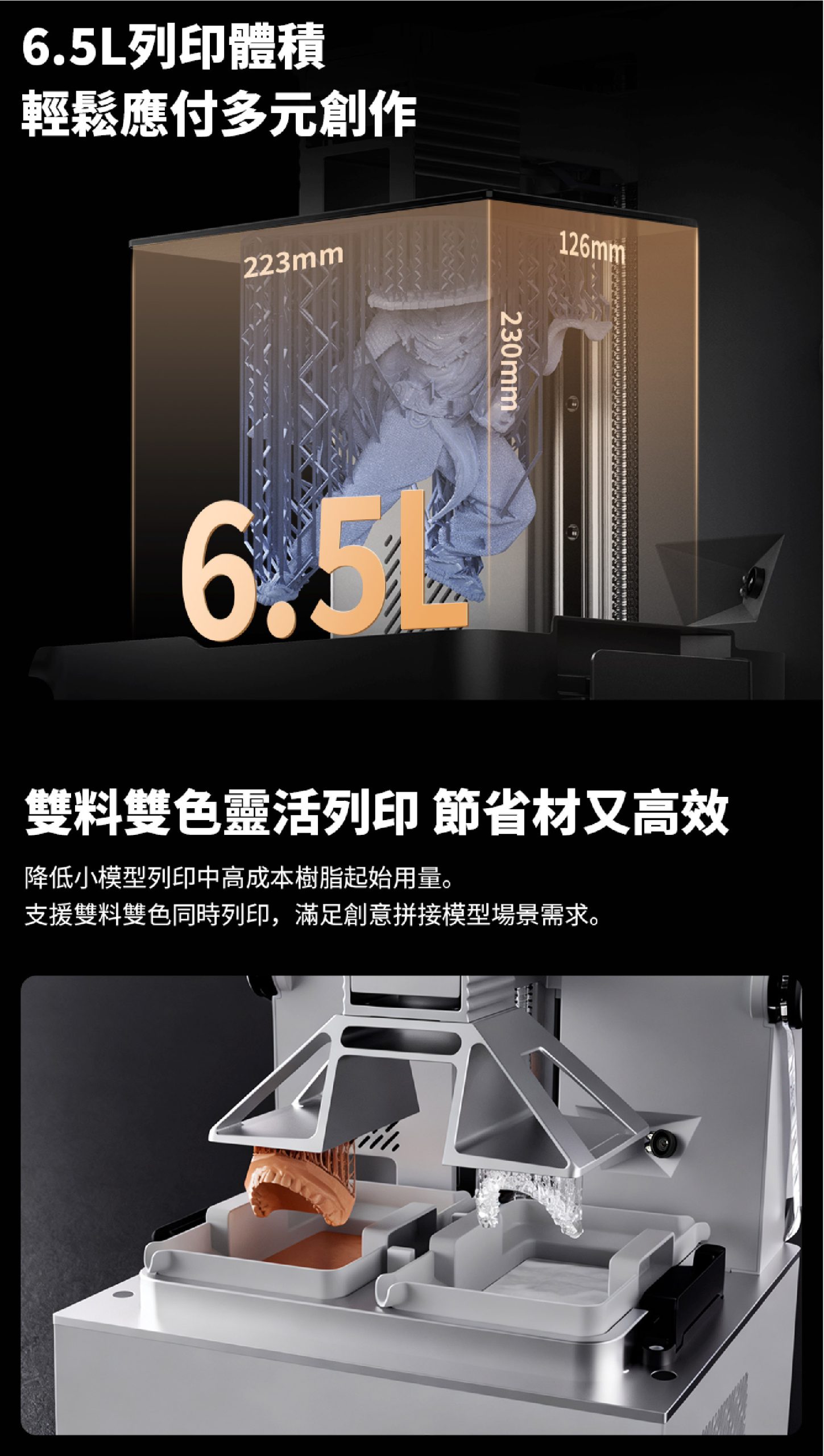 - **雙材料列印:**在切片軟體中為每個樹脂槽指定不同的樹脂類型。每種材料在列印期間使用各自的參數,允許兩者同時處理,同時在整個模型中保持一致的精準度。
