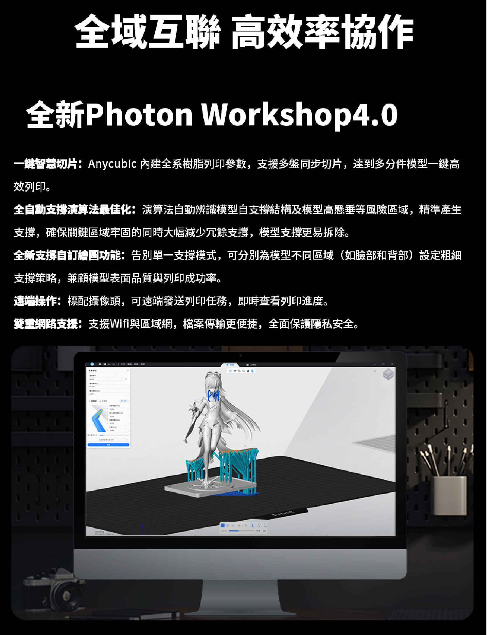 A:相容 Photon Workshop 4.0,Anycubic 最新的切片軟體。新版本具備一鍵切片、自動生成支撐,以及 Anycubic 完整樹脂庫的即用列印配置——提供輕鬆、精準的切片體驗。