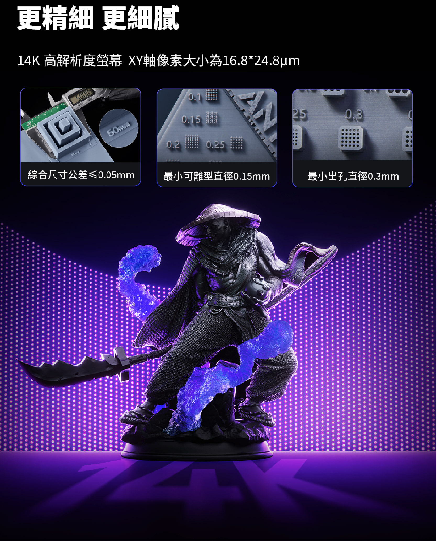 - Photon P1 配備 14K 10.1 吋 LCD 螢幕,提供超精細 16.8μm × 24.8μm XY 精度,搭配 LighTurbo 4.0 光學系統,確保均勻光線分布與更清晰的細節。