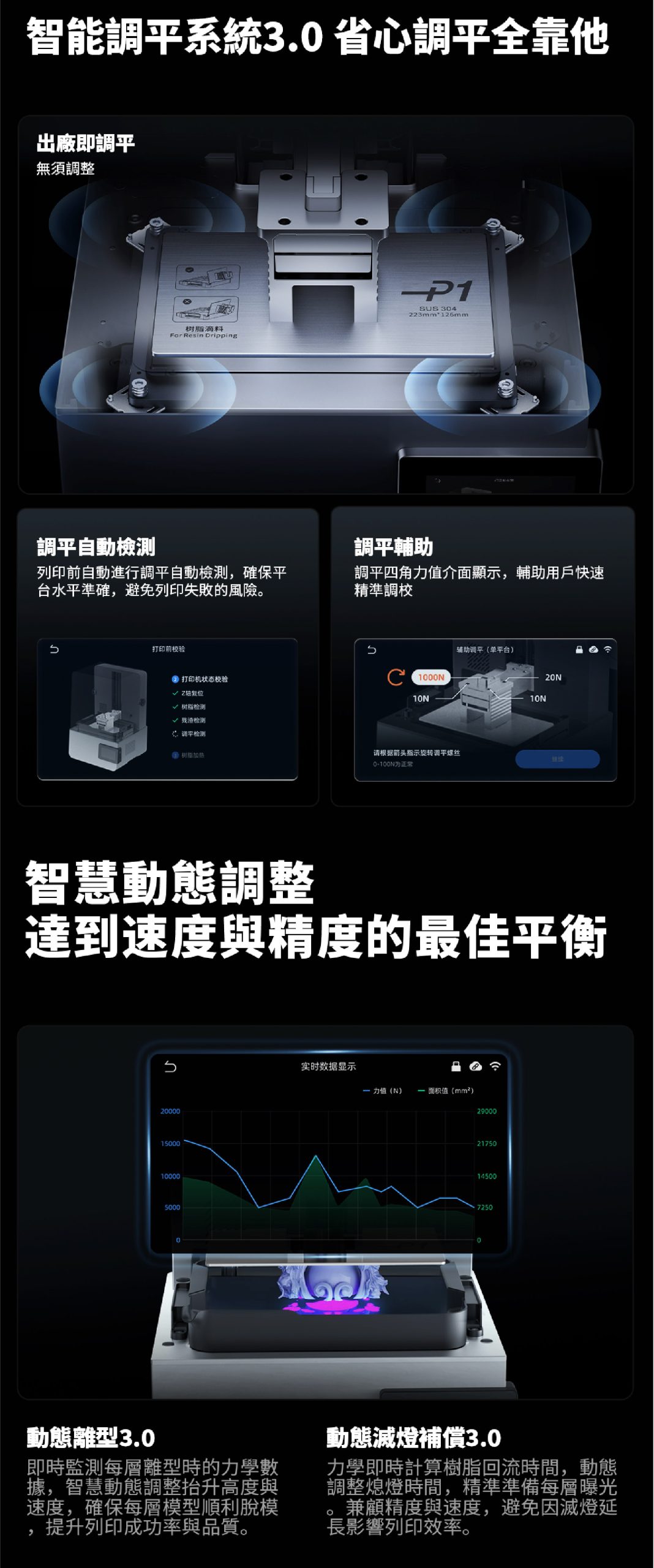 - Photon P1 的工業級滾珠螺桿、智慧調平系統 3.0 與智慧動態平衡系統協同運作,在重複列印中維持一致的精準度與穩定性。