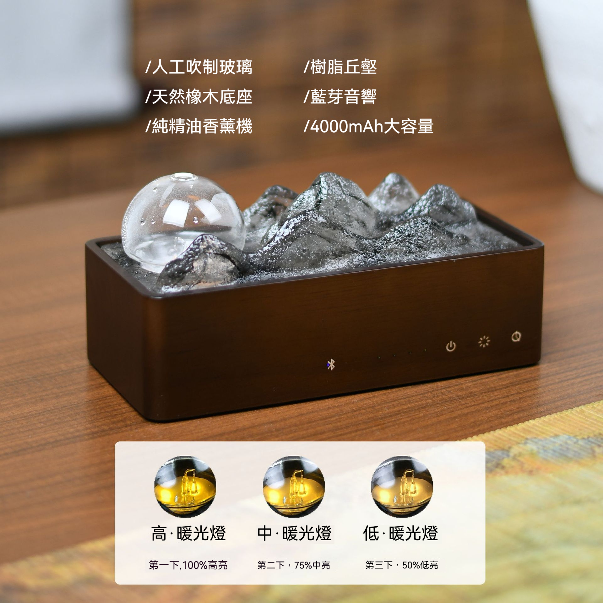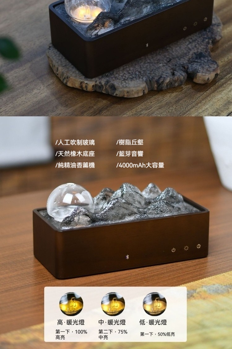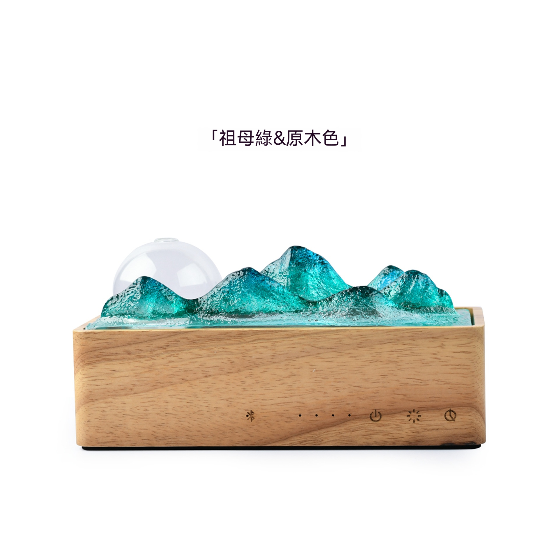 雲海與光影特效: 利用超音波霧化技術,產生的水霧會環繞在山脈造型之間,營造出如真實「雲海」繚繞的視覺效果。搭配可調式的暖色光影,能手動切換或循環顯示不同光感,完美還原日出時分的層次美感。