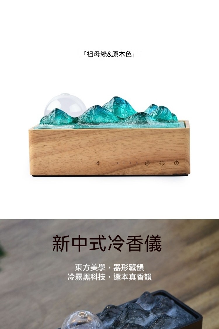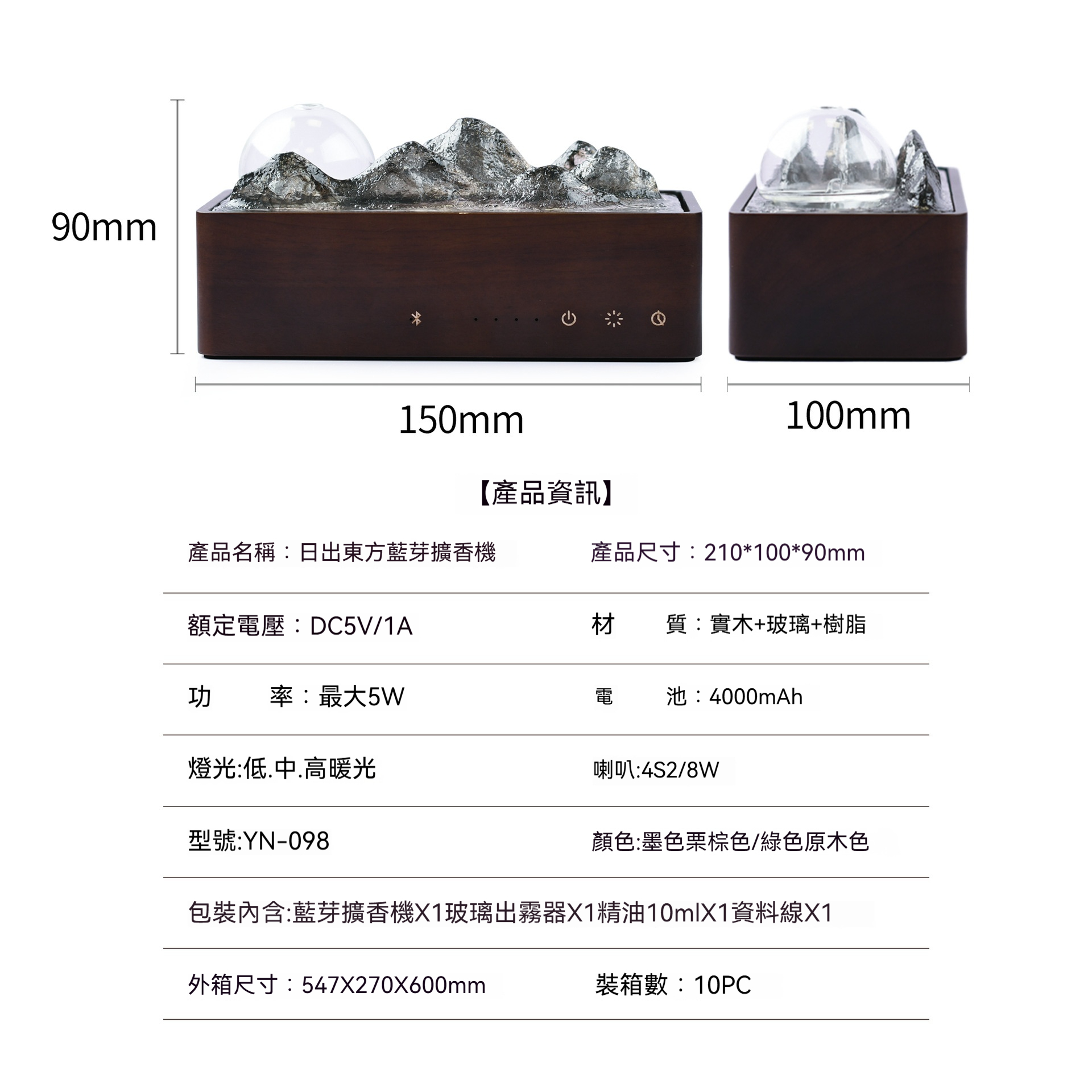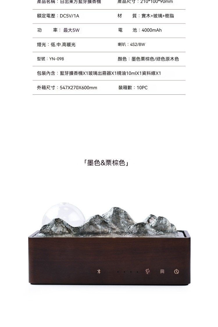 獨特的東方山景美學設計: 產品外觀以山脈輪廓為造型,結合「日出東方」的意象。透過機器內部的燈光效果,光線模擬旭日從山間升起的景象,將擴香機轉化為一件極具禪意的居家藝術裝飾品。