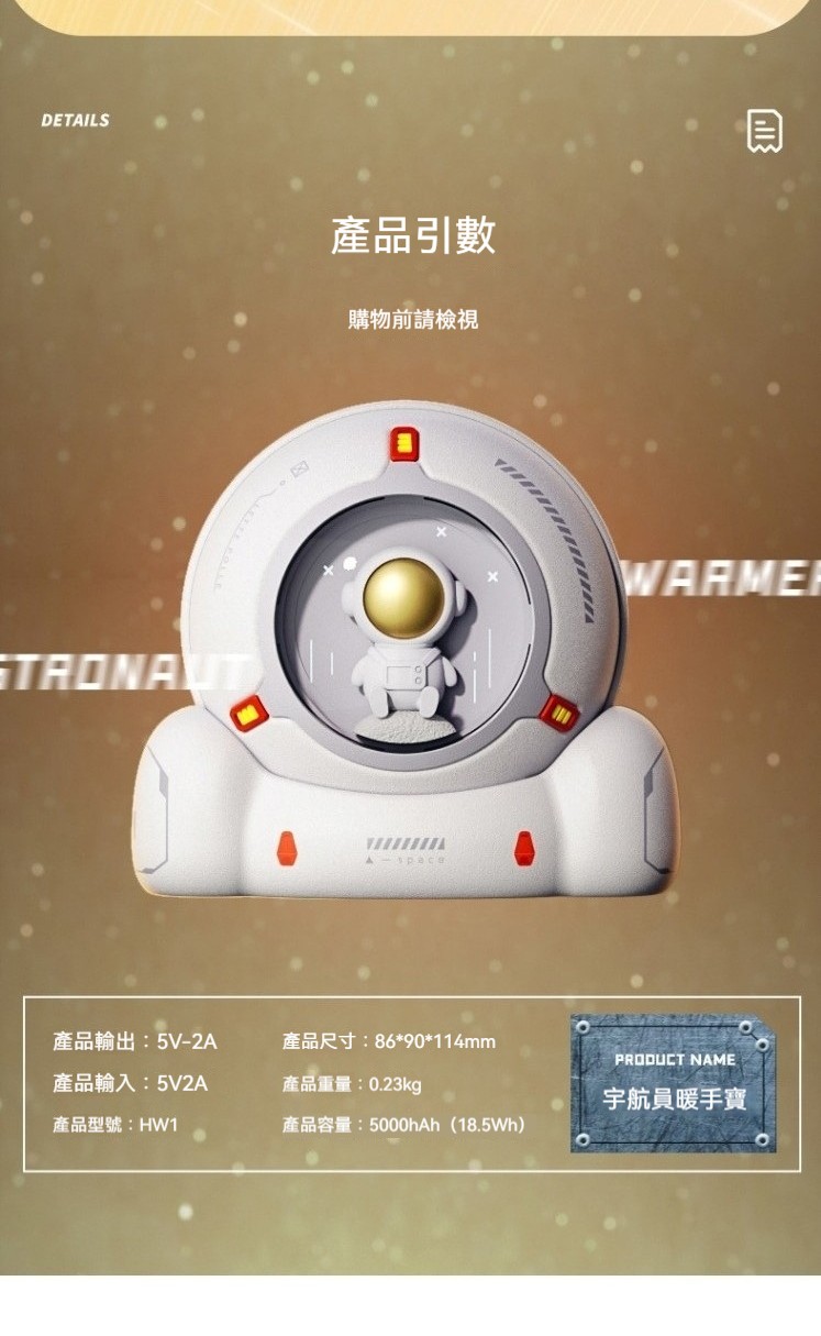 搶先留言 “三合一 太空艙宇航員暖手寶行動電源小夜燈 (品牌直送)”