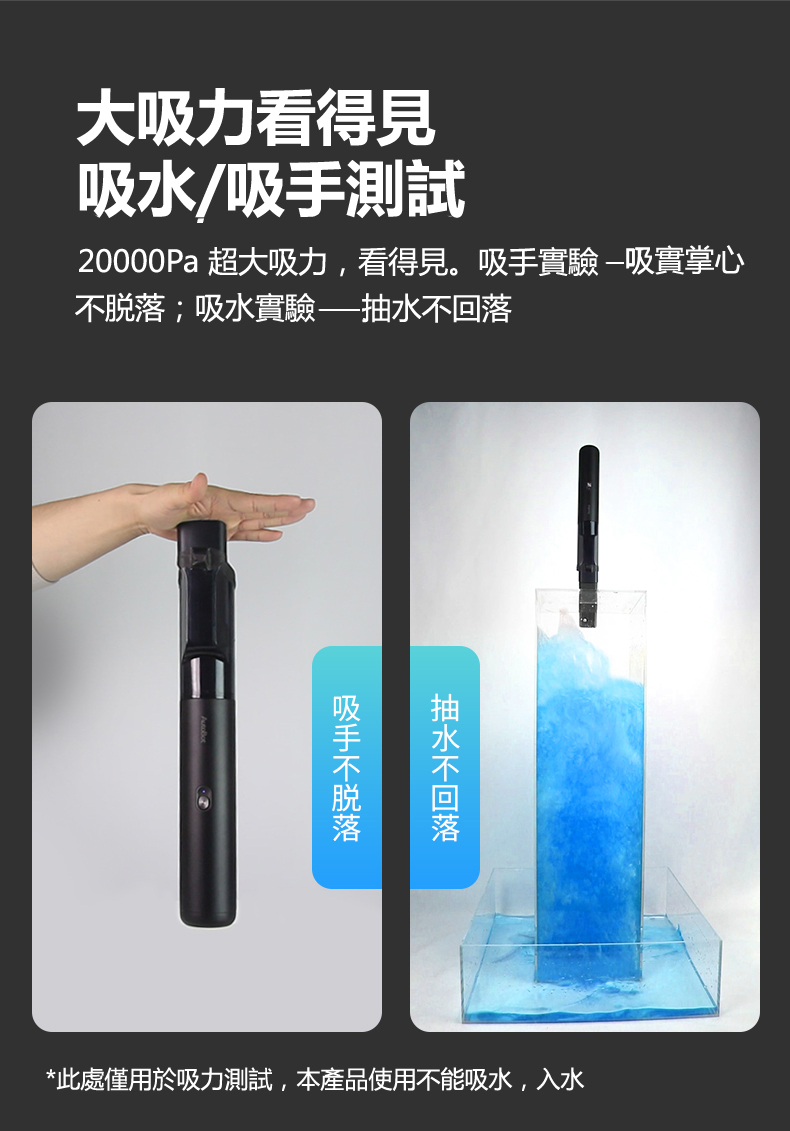 續航時間:強力模式20000Pa (約12分鐘)/ 標準模式12000Pa(約22分鐘)/ 持久模式8000Pa(約50分鐘)