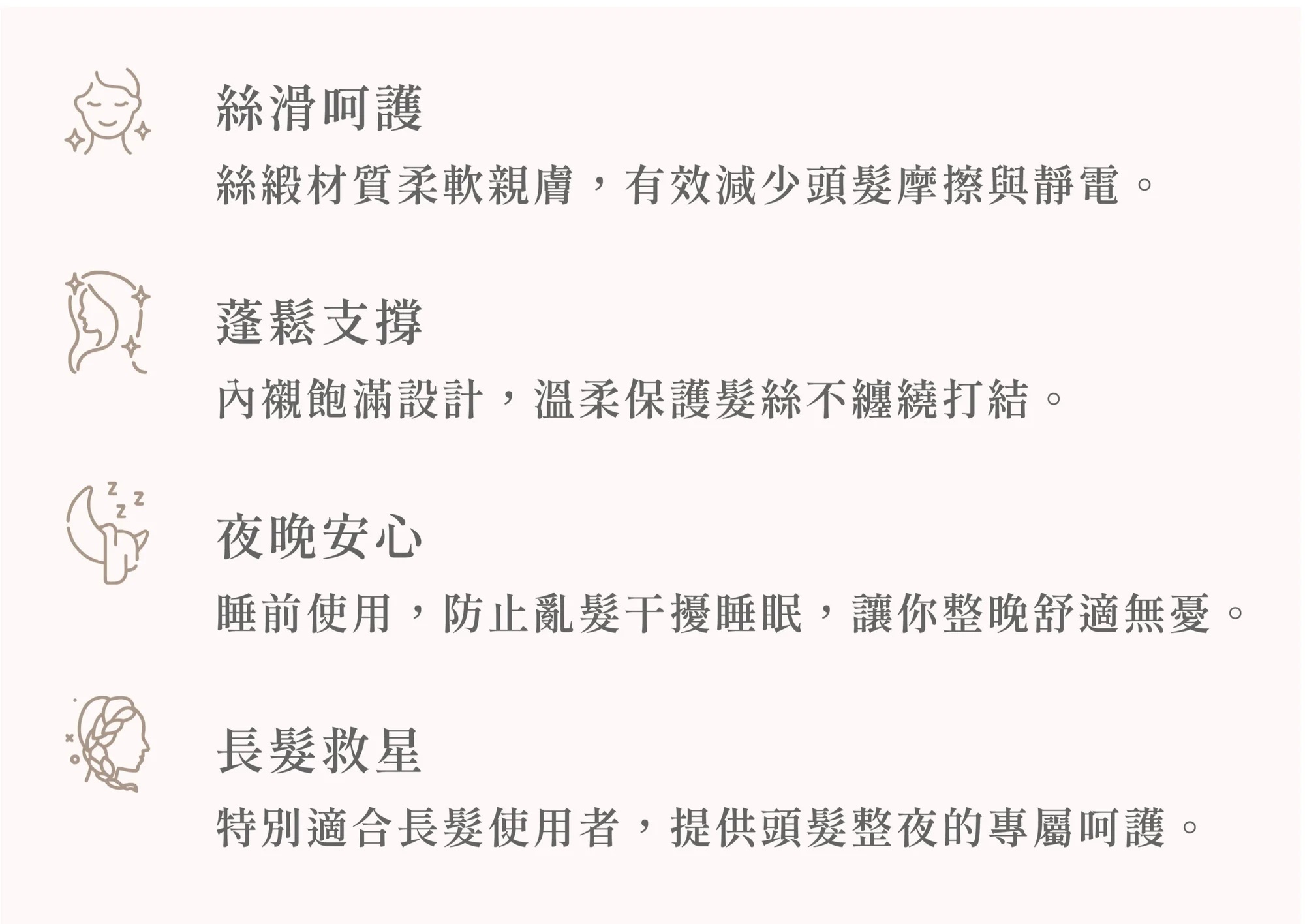 絲緞材質柔軟親膚,有效減少頭髮摩擦與靜電。