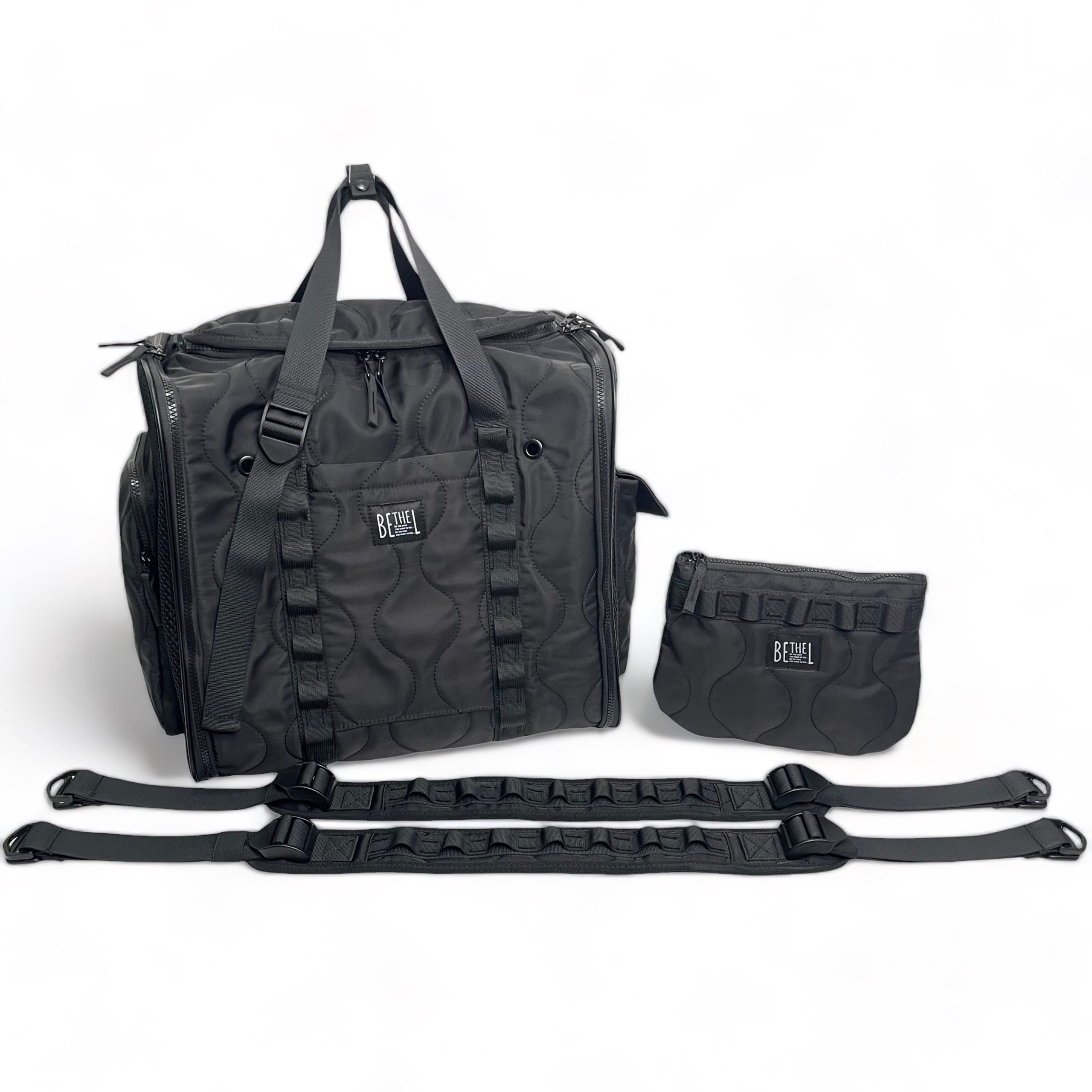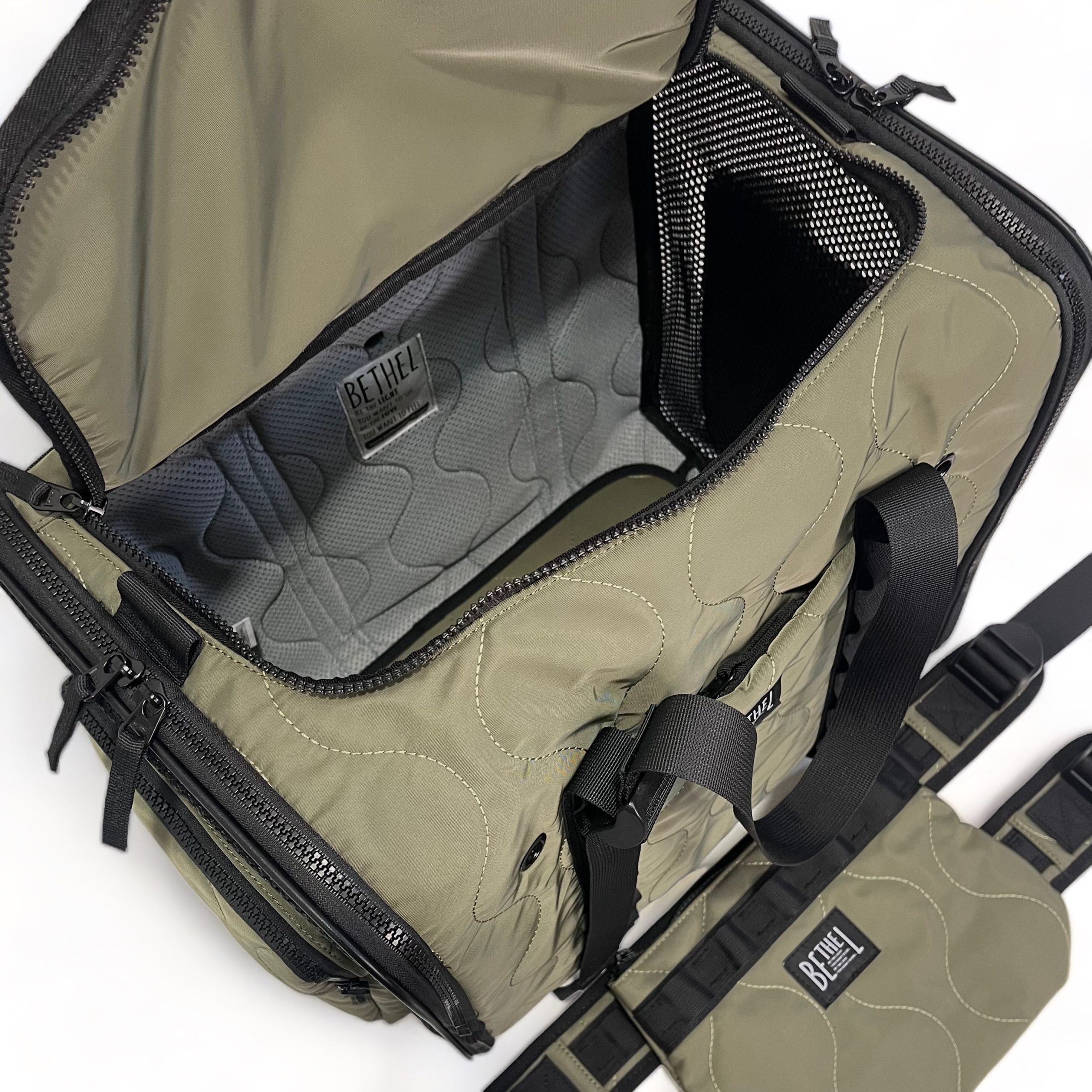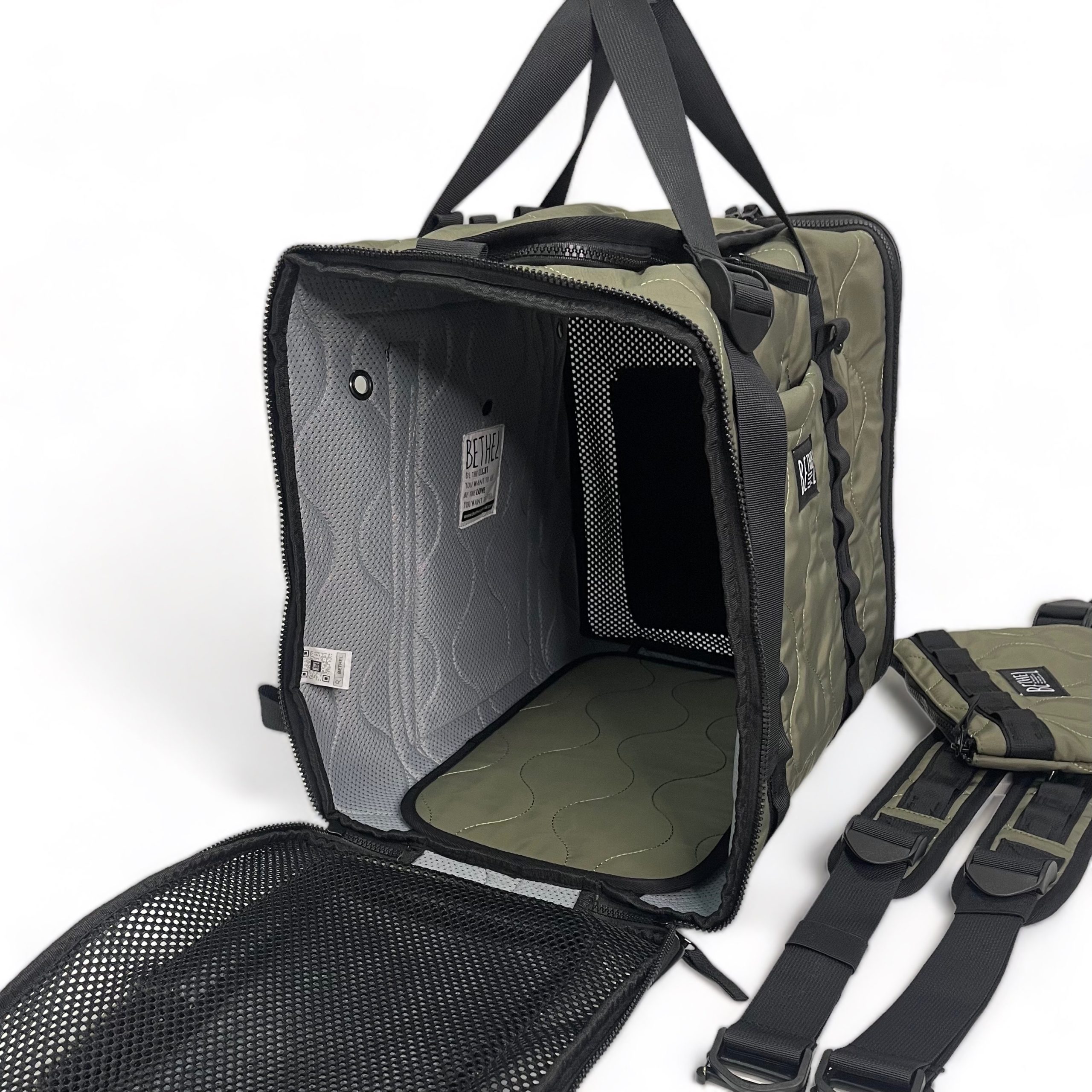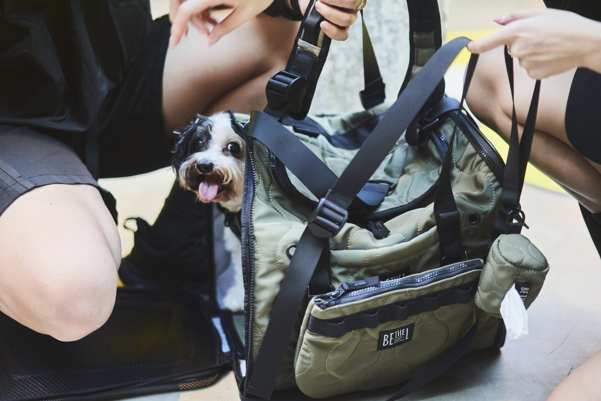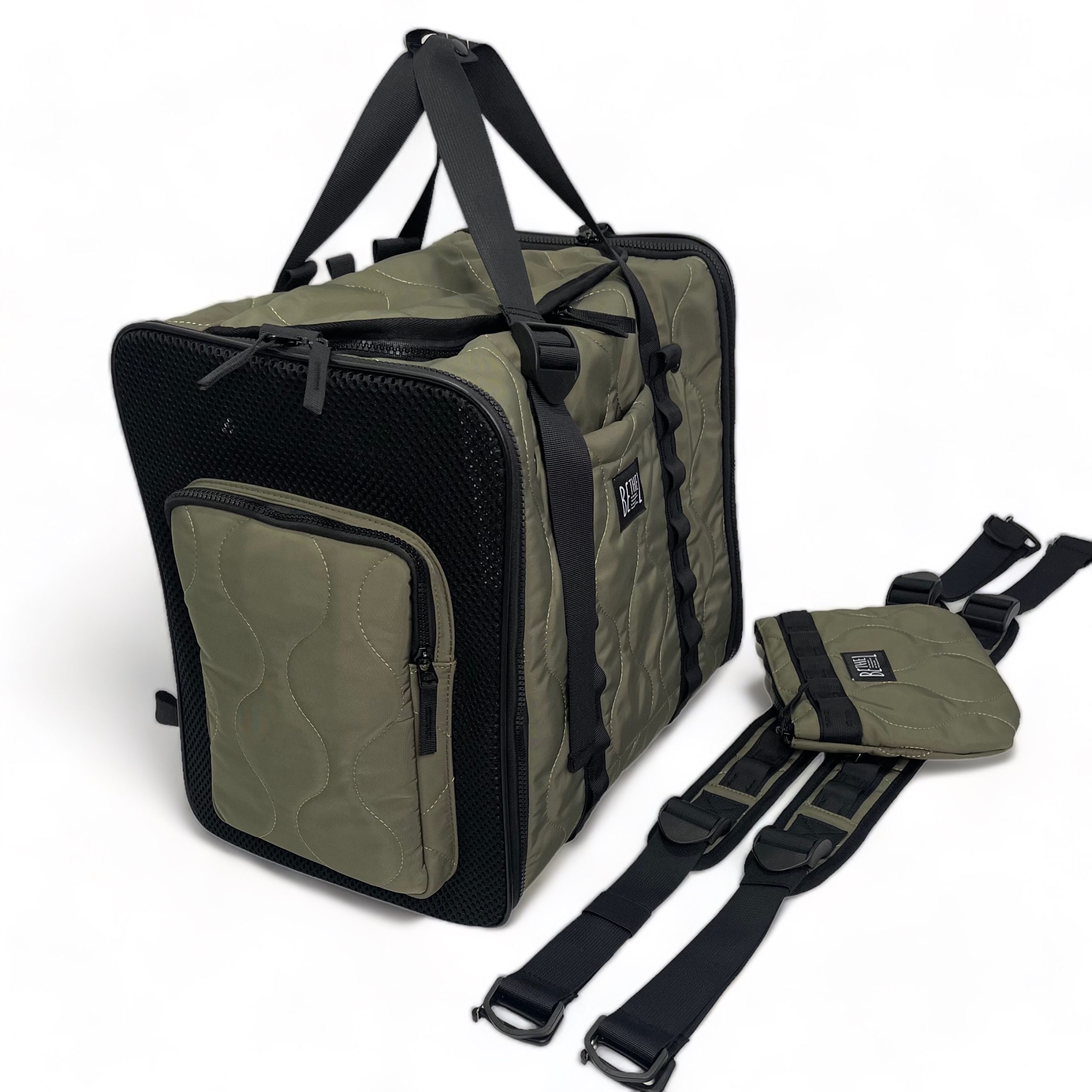 3用寵物袋組合(手挽袋/斜掛袋/背囊 )以輕機能 和 混合軍事風打棗工藝為設計元素,打造出一個集時尚並實用的一個寵物3用袋組合。