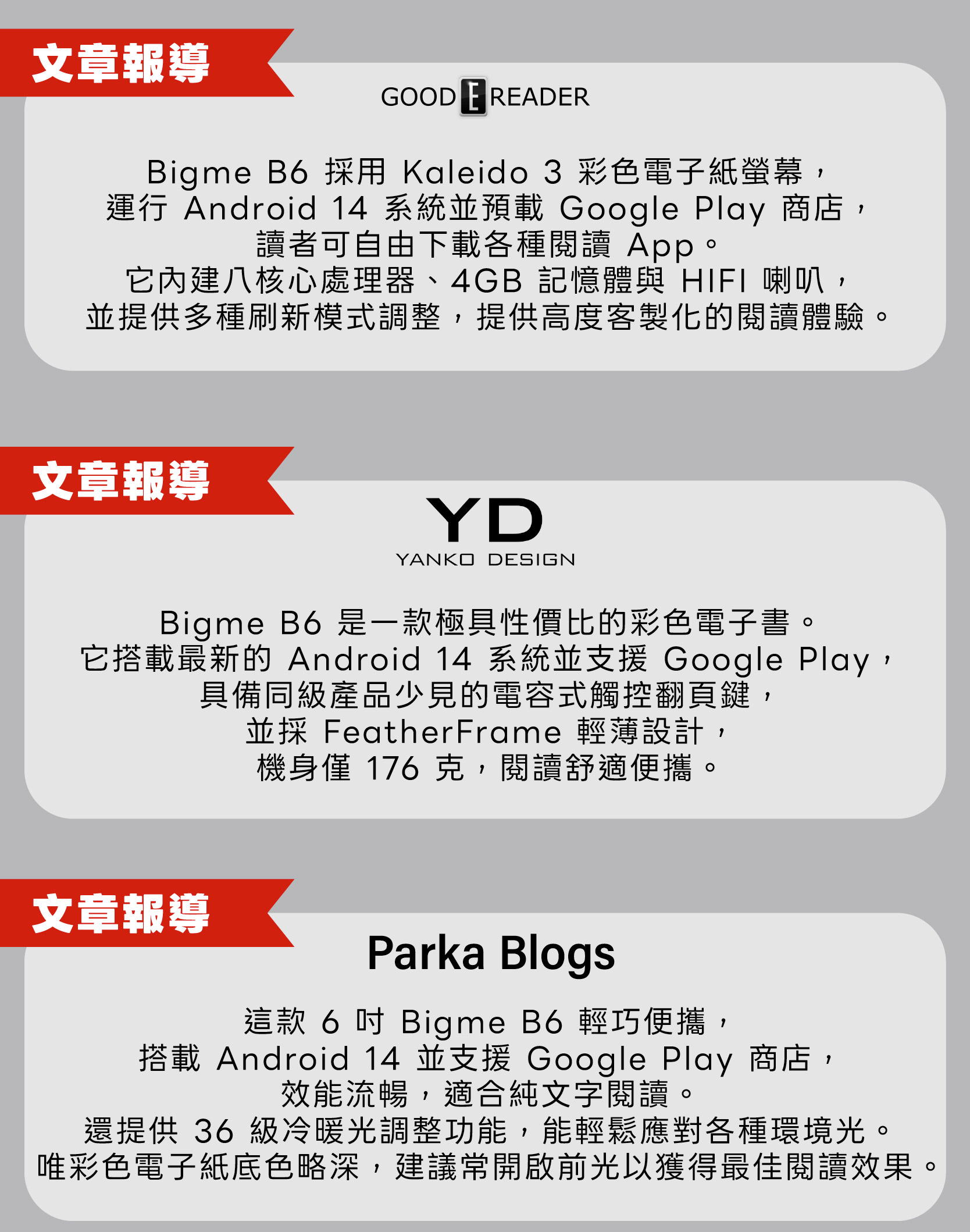 Bigme B6 搭載 Android 14 作業系統,同時內建了 Google Play Store 應用程式,能依照自己的需求做電子書應用程式的下載(如Readmoo 讀墨、Amazon Kindle、樂天Kobo、HyRead、MyBook、博客來電子書、好讀之友、BookWalker 等等),只要在Google Play Store 找到的電子書APP,都可以在Bigme 上使用;如常用的電子書應用程式真的無法在商店中找到,也能透過網頁的搜尋,登陸帳號後進行閱讀。