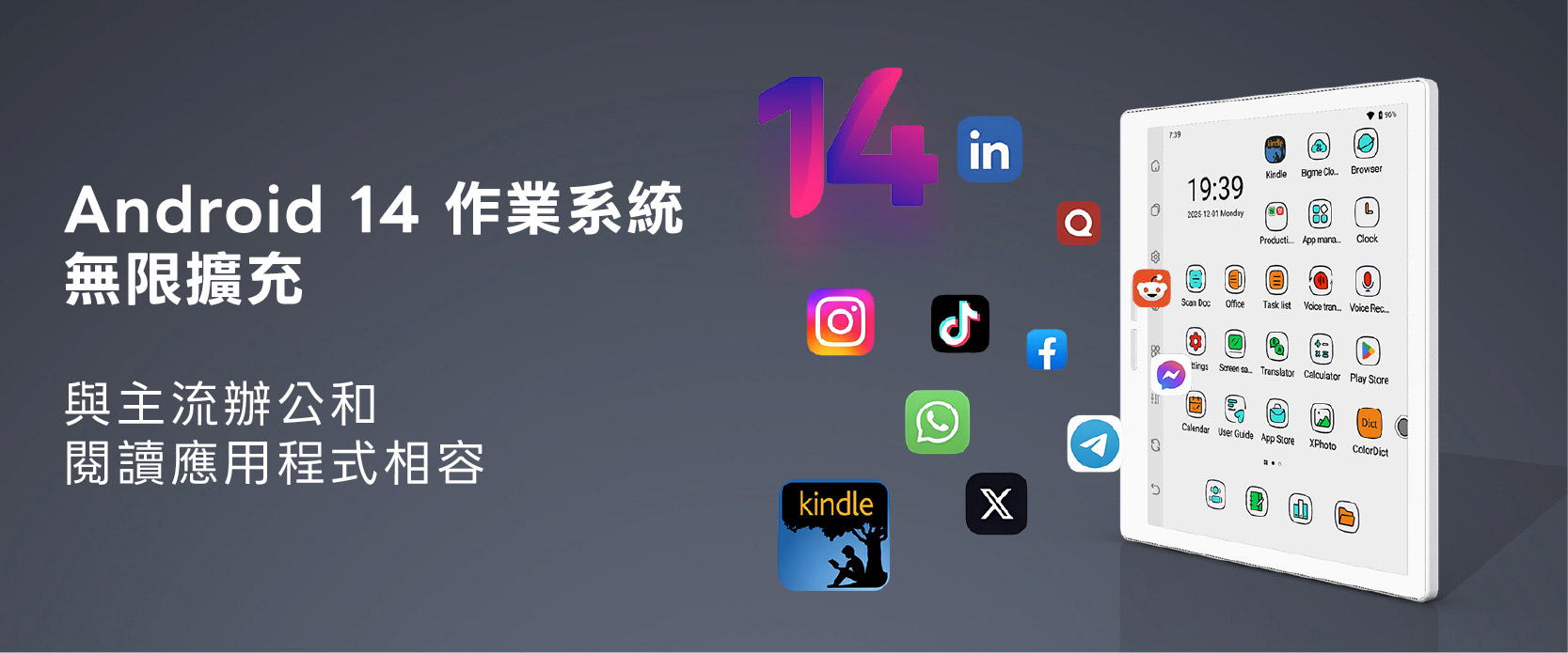 B751C S 運行最新的 Android 14 開放式作業系統,提供極大的靈活性。您可以從 Google Play 商店下載各種應用程式(如Readmoo 讀墨、Amazon Kindle、樂天Kobo、HyRead、MyBook 、博客來電子書、好讀之友、BookWalker 等等),只要在Google Play Store 找到的電子書APP,都可以在Bigme 上使用;如常用的電子書應用程式真的無法在商店中找到,也能透過網頁的搜尋,登陸帳號後進行閱讀。