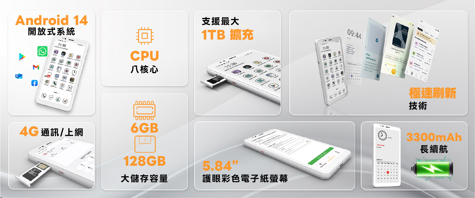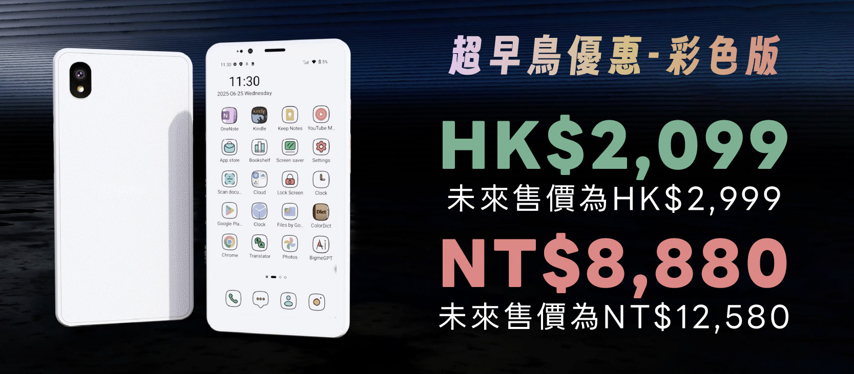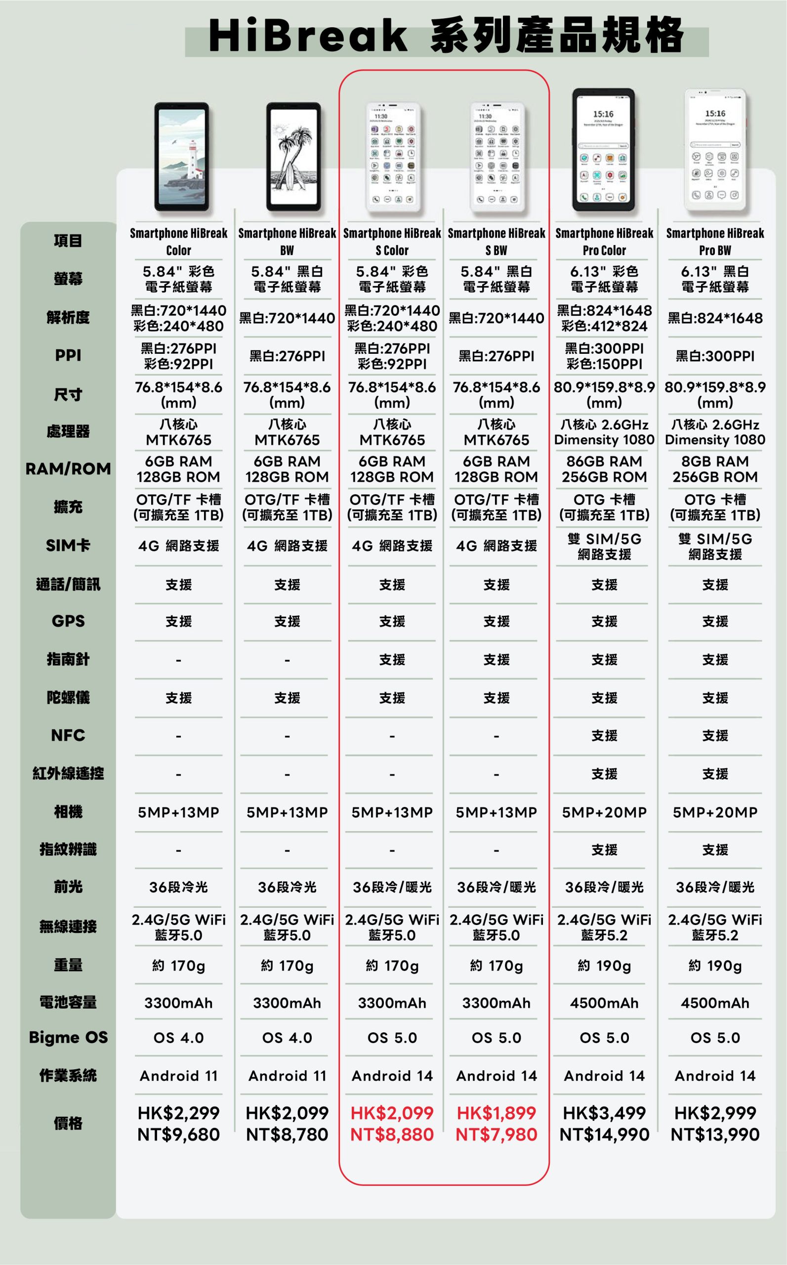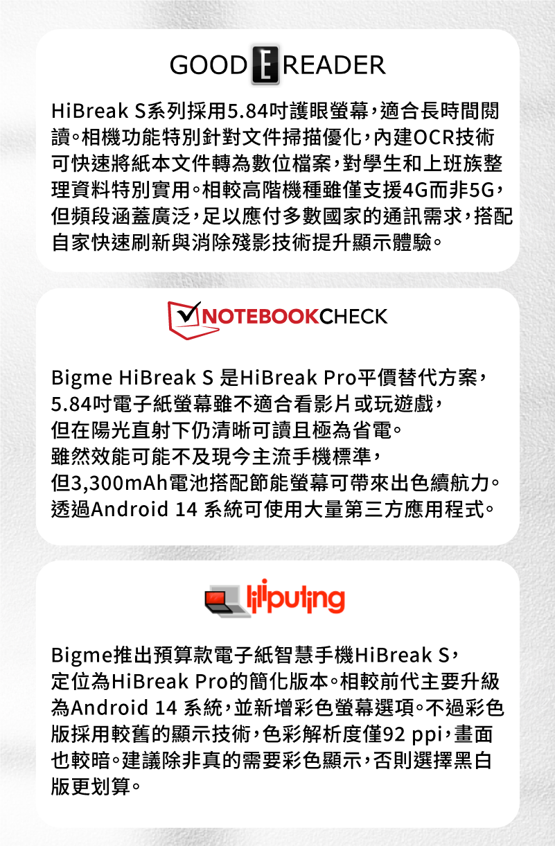 Bigme HiBreak S 是一款專為舒適閱讀和長時間使用而設計的獨特智慧型手機。配備 5.84 吋電子紙螢幕,提供黑白和彩色版本可選,以紙張般的視覺體驗減少眼睛疲勞。