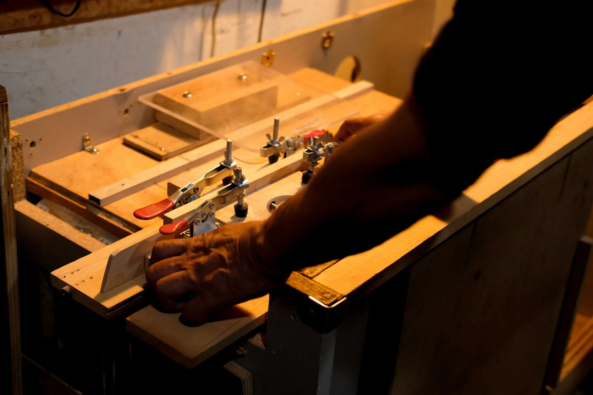 第一步是拼合和鋸切,以將粗糙的木材轉變成光滑的木板,並將一整塊的木板切成合適的尺寸。然後,木匠將開始在木工之間鑽孔打孔,以便將燈安裝在木材合適的位置內。之後的程序就是打磨,刮擦,銼削和精加工。這些過程都非常重要,需要十分好的經驗和技巧來完成。這些關鍵步驟能直接影響最終產品的觸感,顏色和質量。