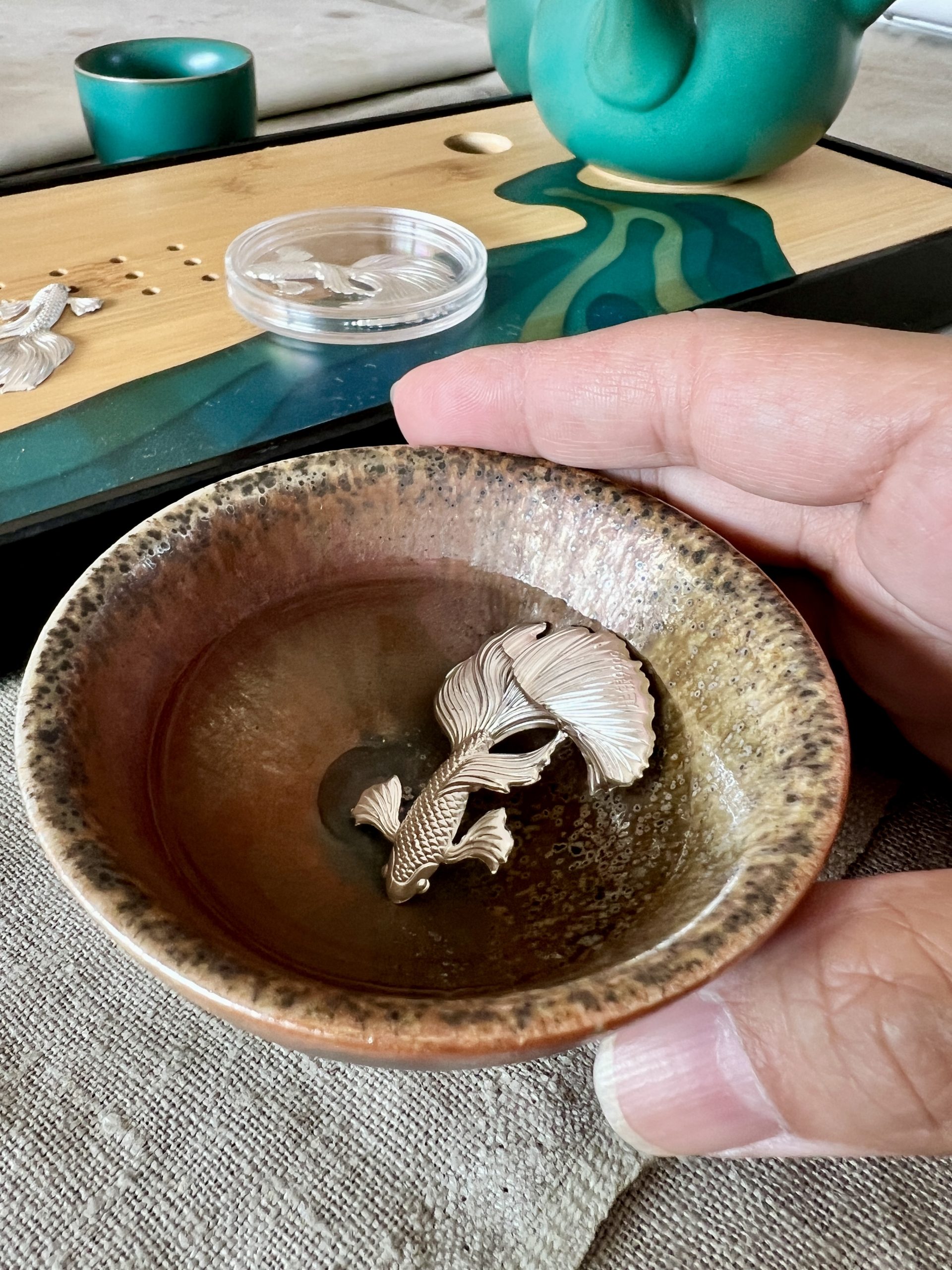 以999純銀薄片打造成栩栩如生之孔雀魚樣式,