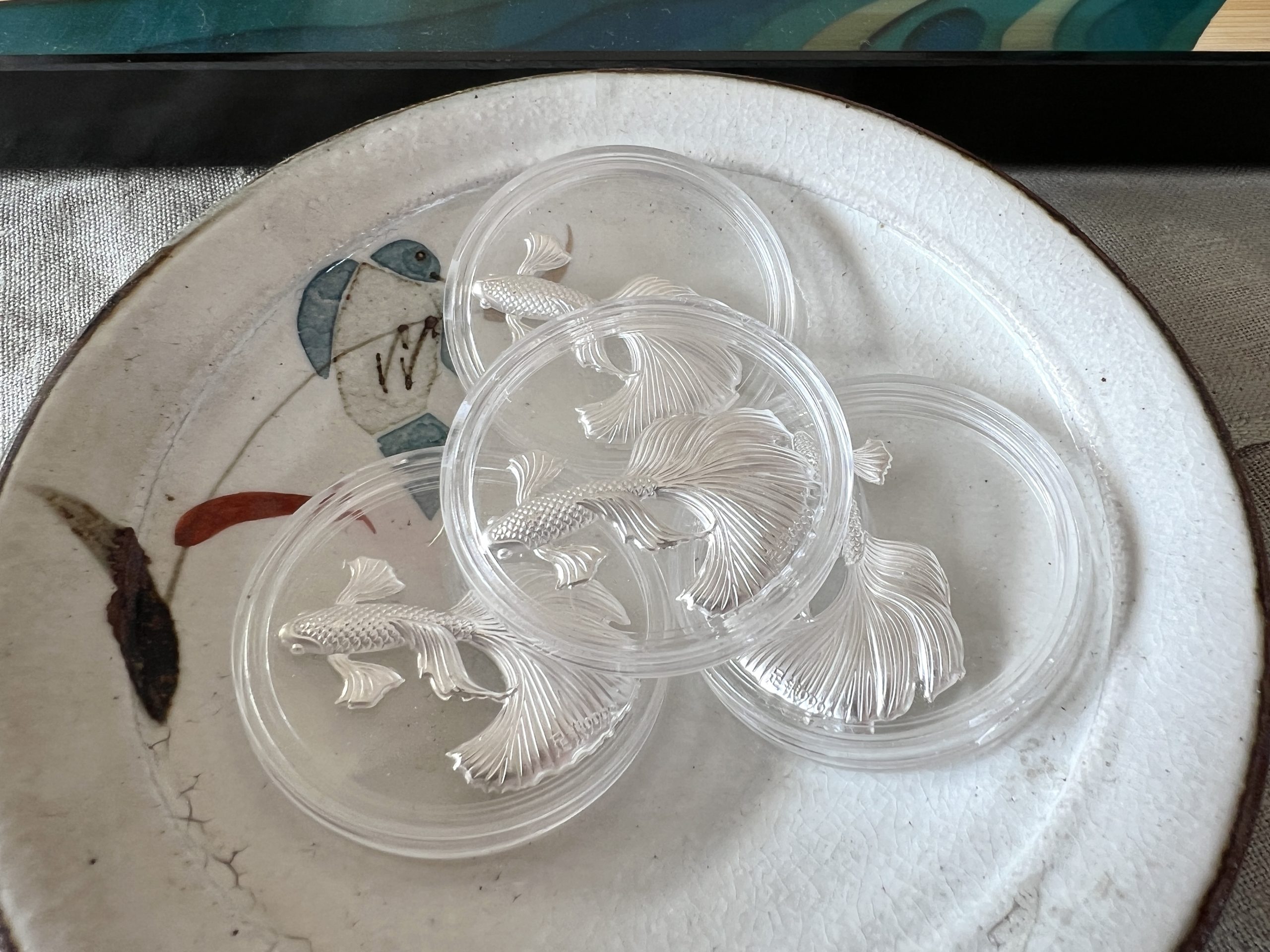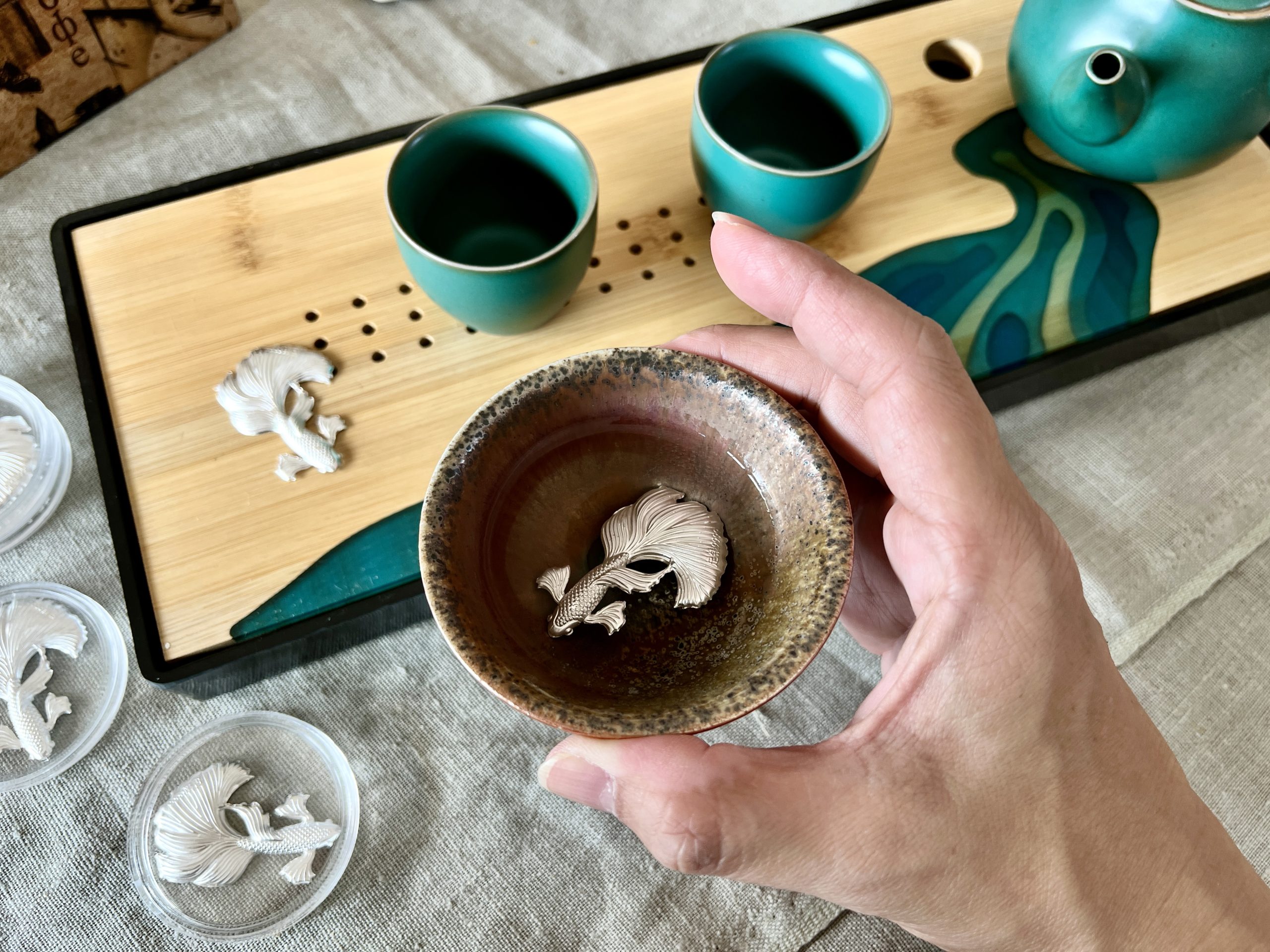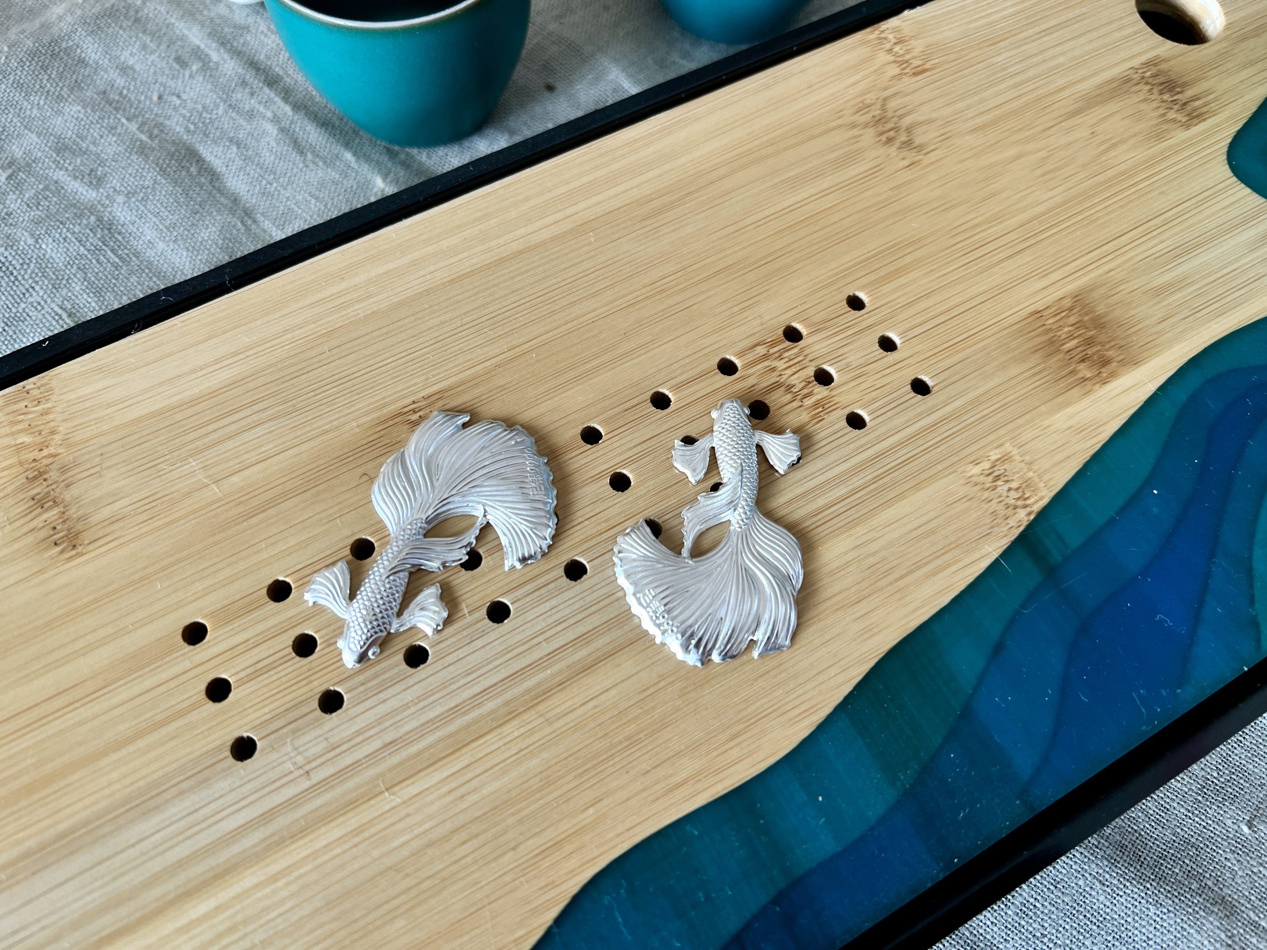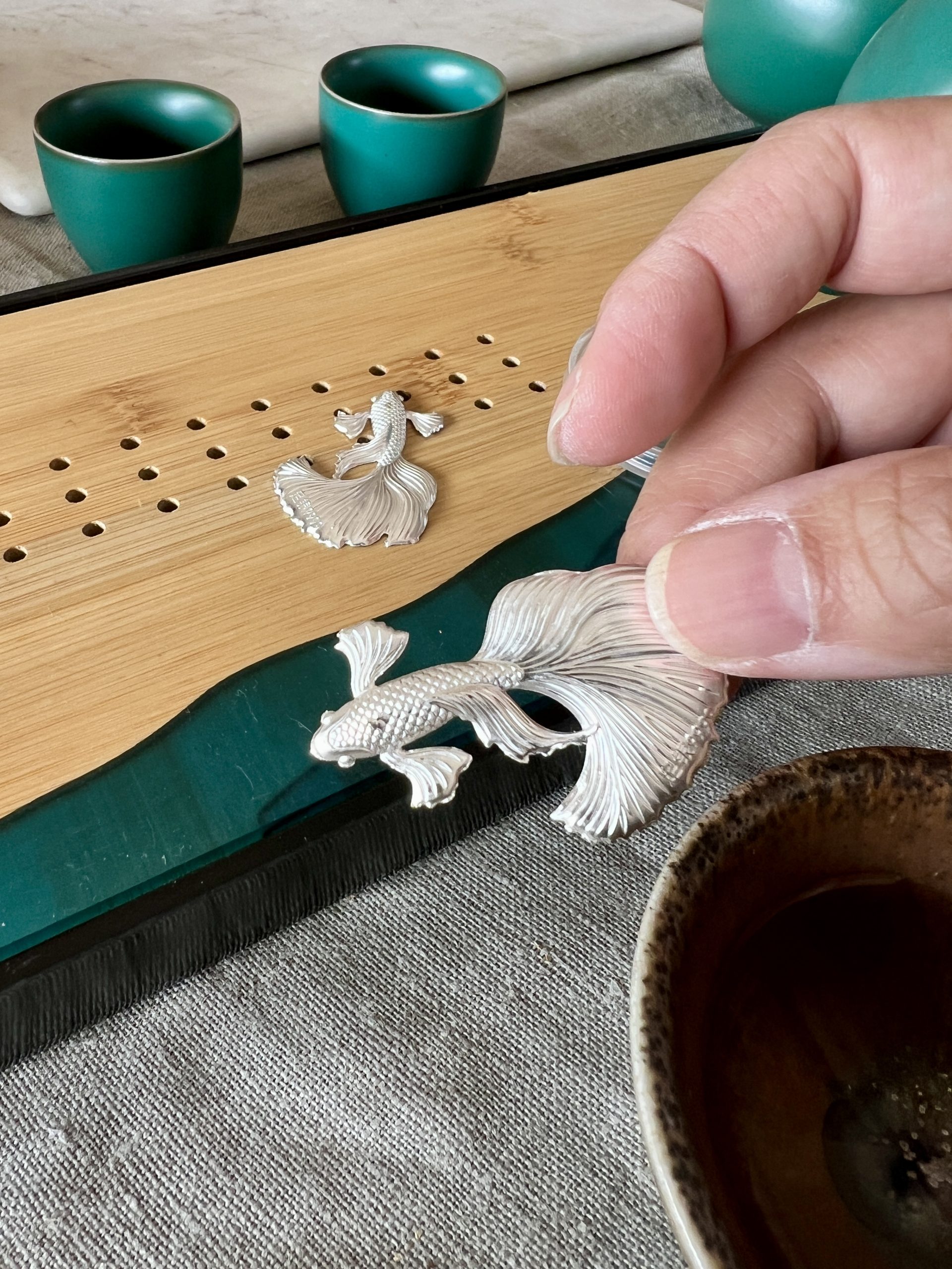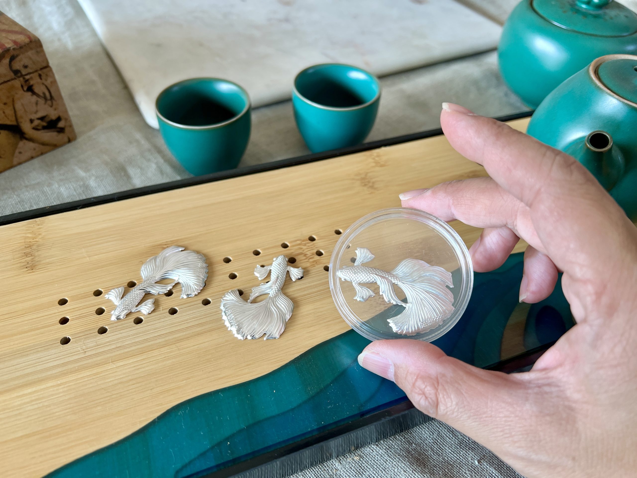 以999純銀薄片打造成栩栩如生之孔雀魚樣式,