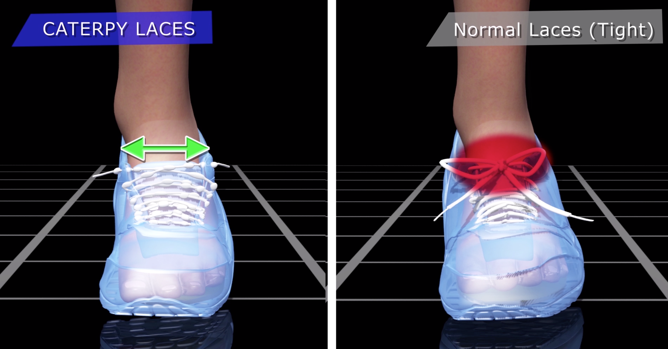 傳統鞋帶的結會容易令腳部造成窒息點,減少了雙腳的血液循環。