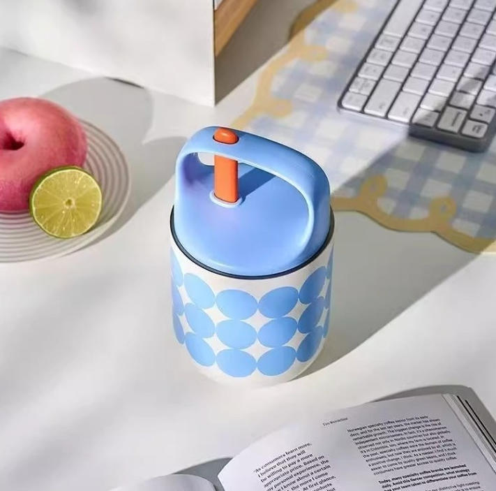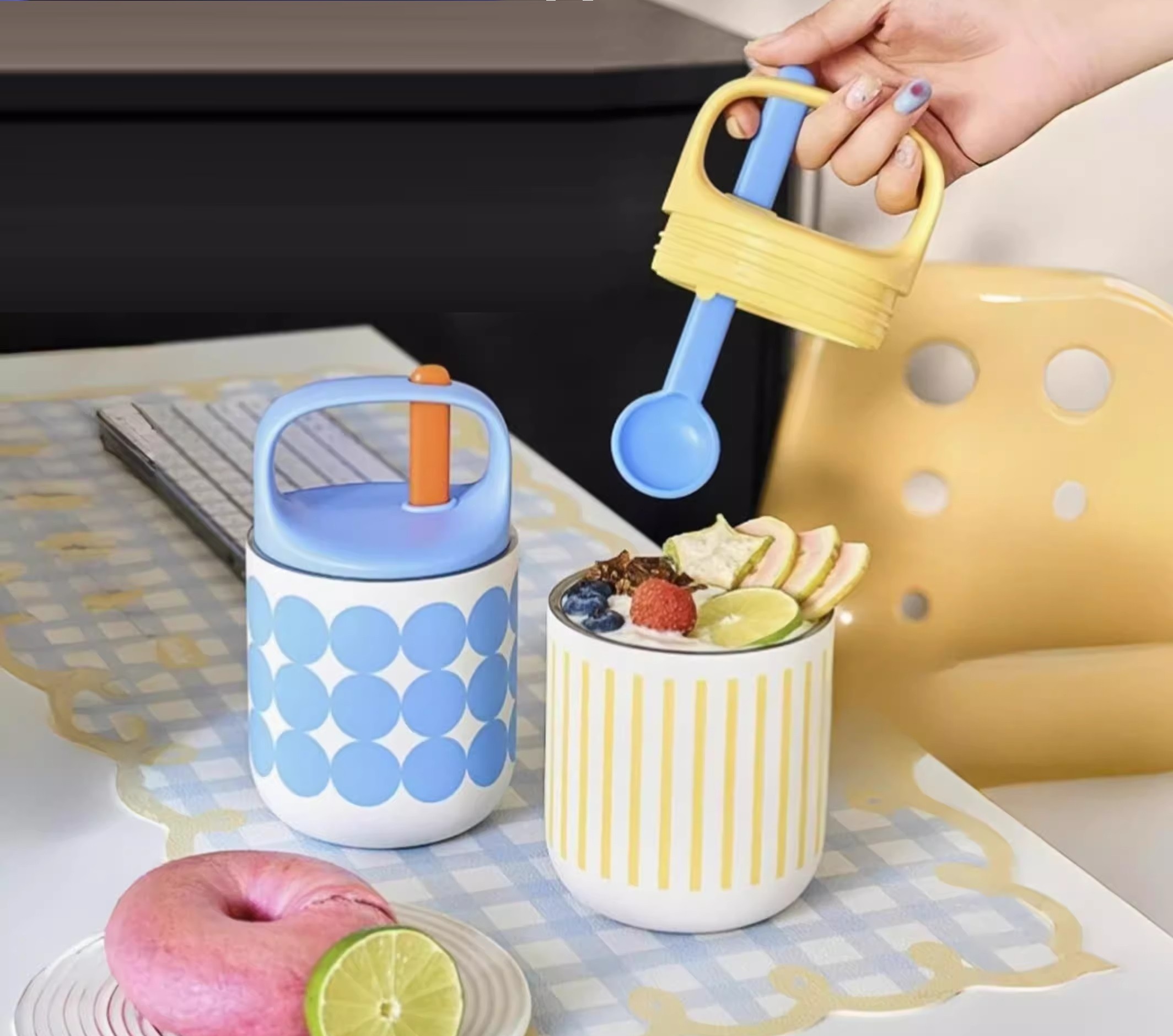 飽飽杯-樹莓燕麥(粉橘), 飽飽杯-甜玉米(白黃), 飽飽杯-藍莓貝果(黃藍), 飽飽杯-魚丸湯(白藍)